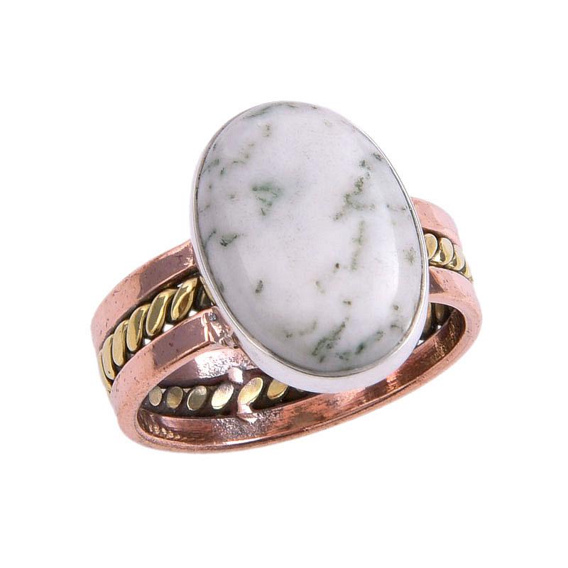 Кольцо из серебра 925 пробы с натуральным зеленым опалом и дендритом, двухцветное, размер 8, к7 г 36