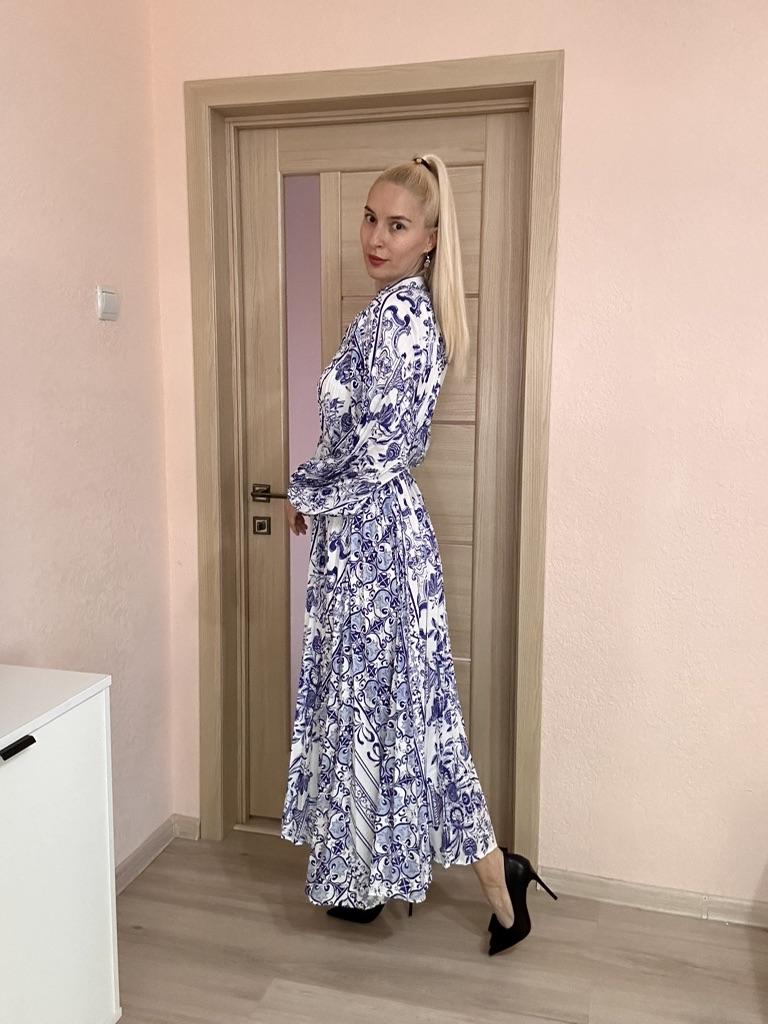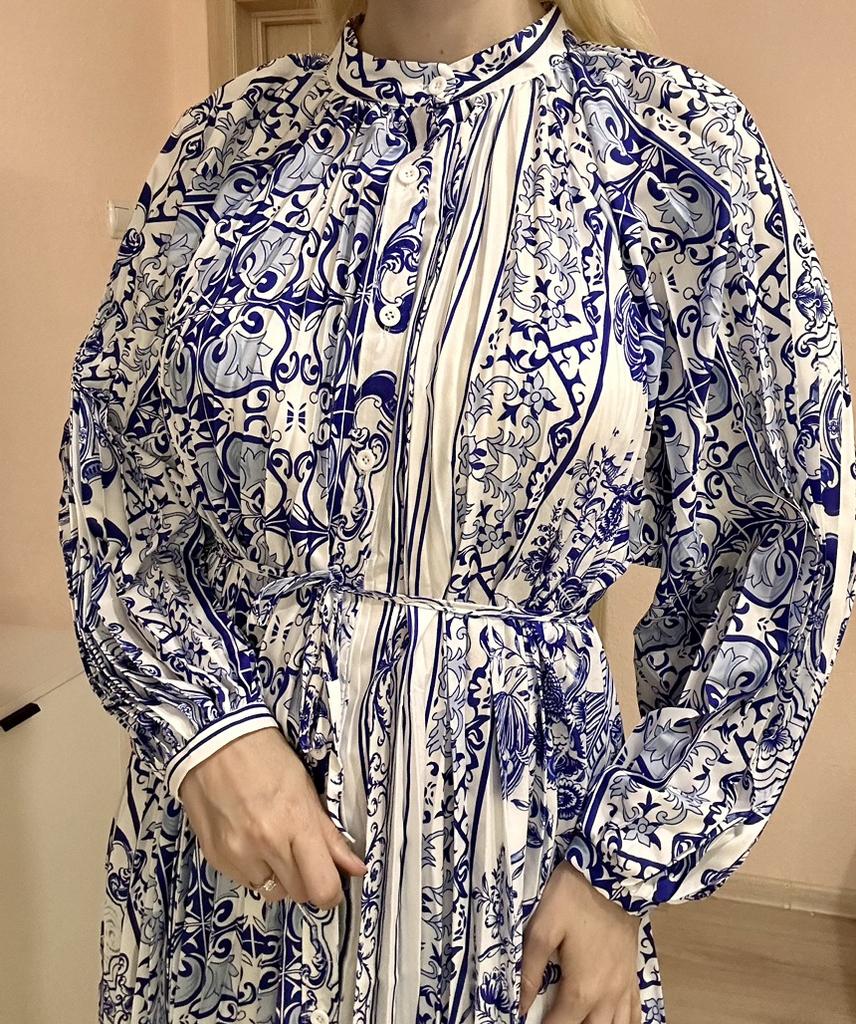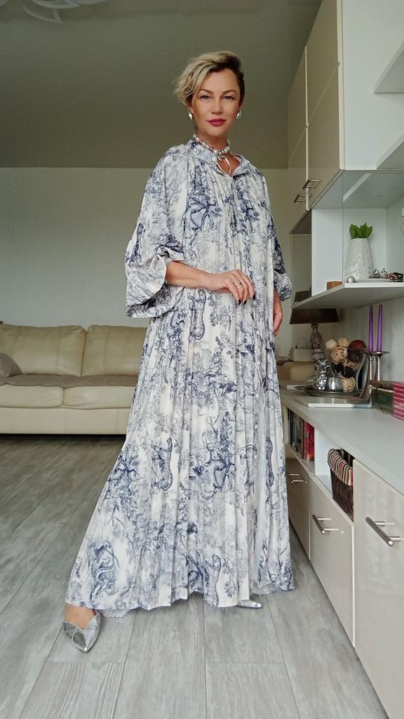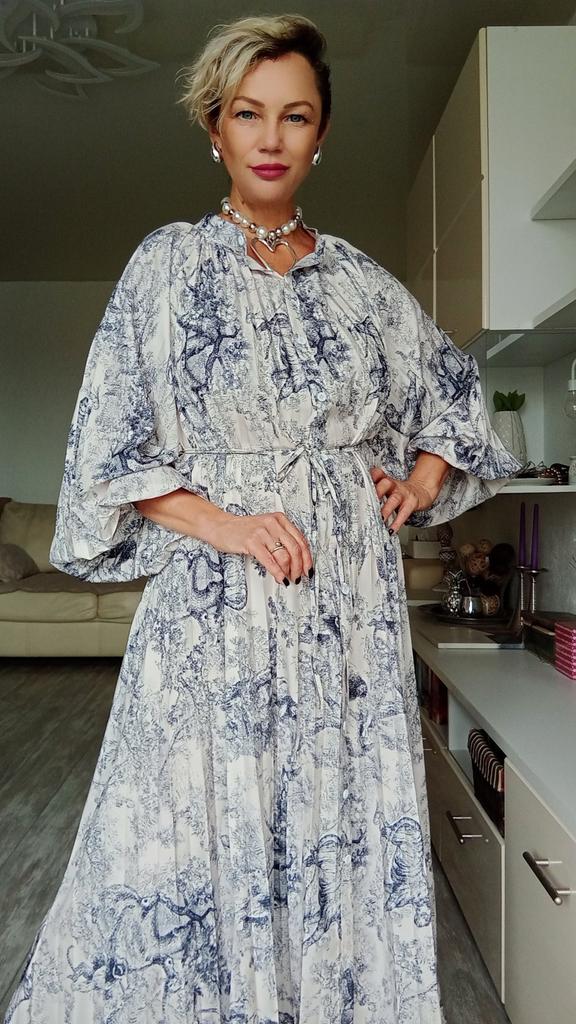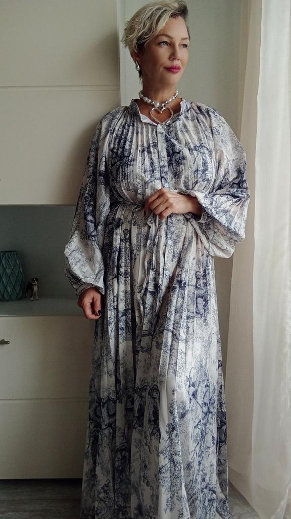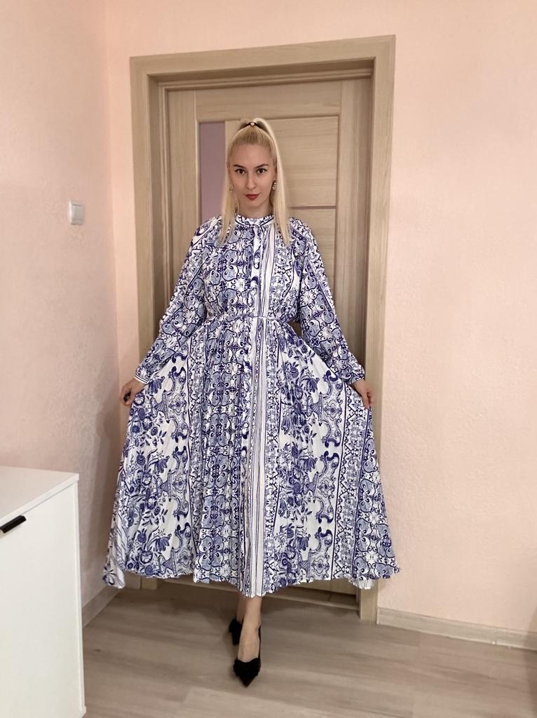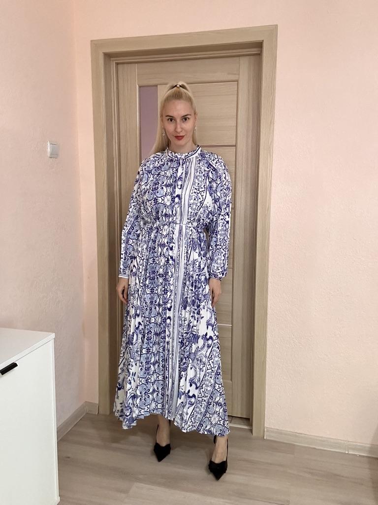 Достойно царицы 👸 Привет! Не каждая сможет носить это платье. Оно очень величественное, тут много ткани, платье прям окутывает фигуру и в нем можно потеряться. Это платье сразу Вас "съест" если вы сутулитесь или если Вы очень худая + не высокого роста. Идеально платье сядет на вкусные параметры или на высокий рост. ‼️добавила не большое видео‼️ Ткань: Похожа на мягкий атлас, но ткань нежная в меру тонкая, не просвечивает, не тянется. Очень приятная к телу. Ткань вся в складочках плиссе, почти не требует утюга и не мнётся. Дизайн: Платье халат, застёгивается на ряд пуговок спереди, линия плеч отсутствует, рукава объёмные, длиные, фонариком. Низ платье имеет расширение прям от груди вниз. Качество: Сшито супер, не нашла к чему придраться. Нюансы: Я заказываю это платье почти три года подряд, у меня уже мини коллекция их в разных оттенках, так вот в комплекте есть пояс - это платье пришло без него. Видимо мне забыли положить 😁 Сезон: Лето Цвет: Белый с геометричным рисунком Размер: На мне единый размер. Мои параметры: рост 172 см 98/76/106 см Детали: Длина 135 см Длина рукава 70 см ОГ 150 см и более так как плиссе еще растянет ткань. ОТ 200 см и более... Резюмирую: Это платье всегда делает Вас центром внимания и к этому тоже надо быть готовой. Как и писала Выше не смотрится оно на маленьких и худеньких, платье Вас просто съест, а вот на дамах с пышными параметрами или высоким дамам - это платье прописано, как витамин для высокой самооценки! Рекомендую 👍 Я не прощаюсь, M_K Сложная_геометрия