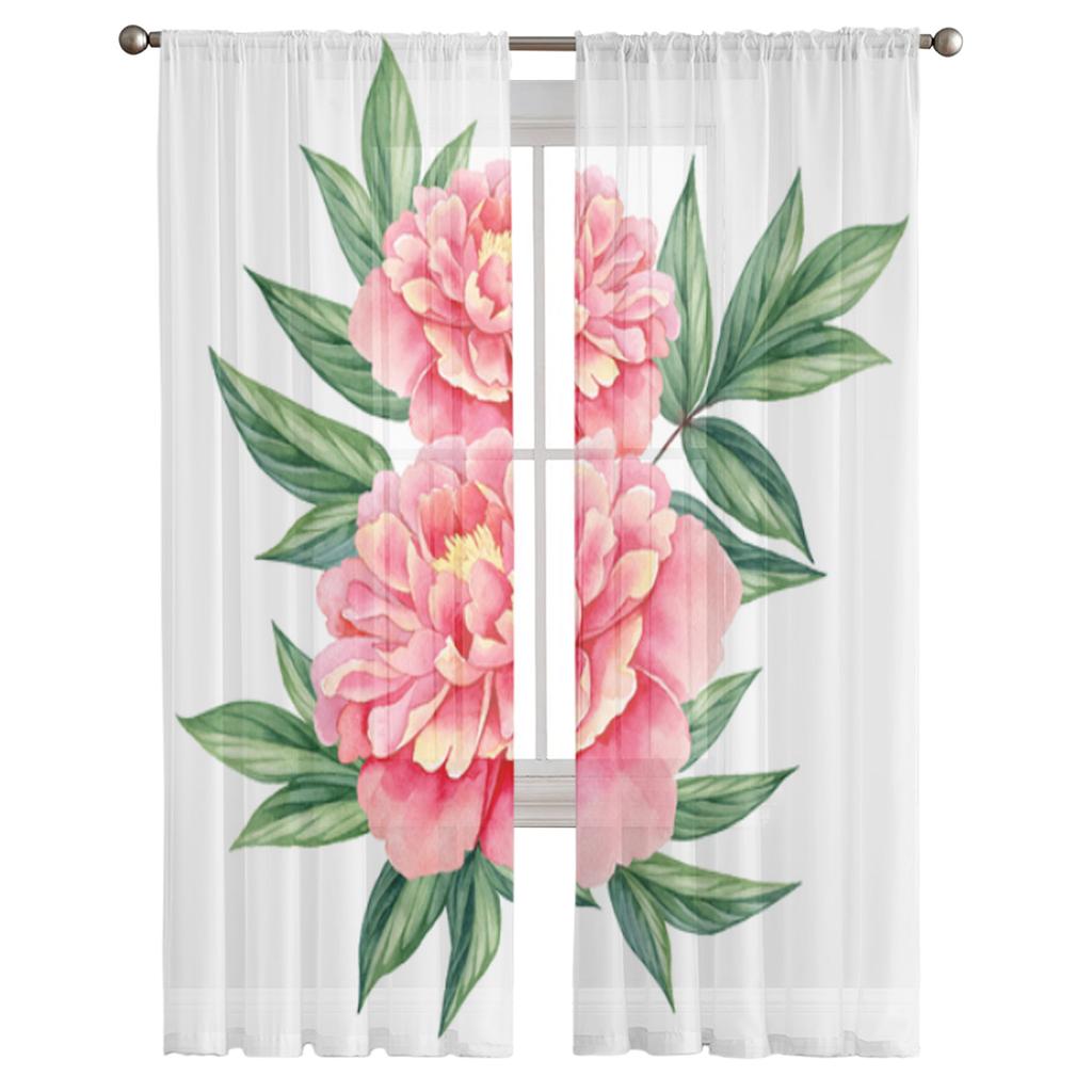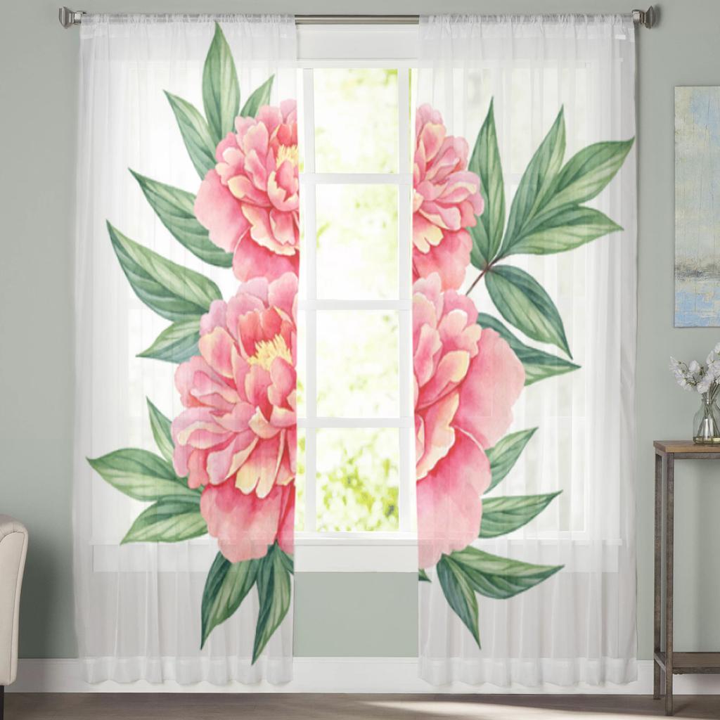 Акварельный цветок пион розовые зеленые листья винтажные белые прозрачные шторы для гостиной тюль на окно спальня кухонные шторы