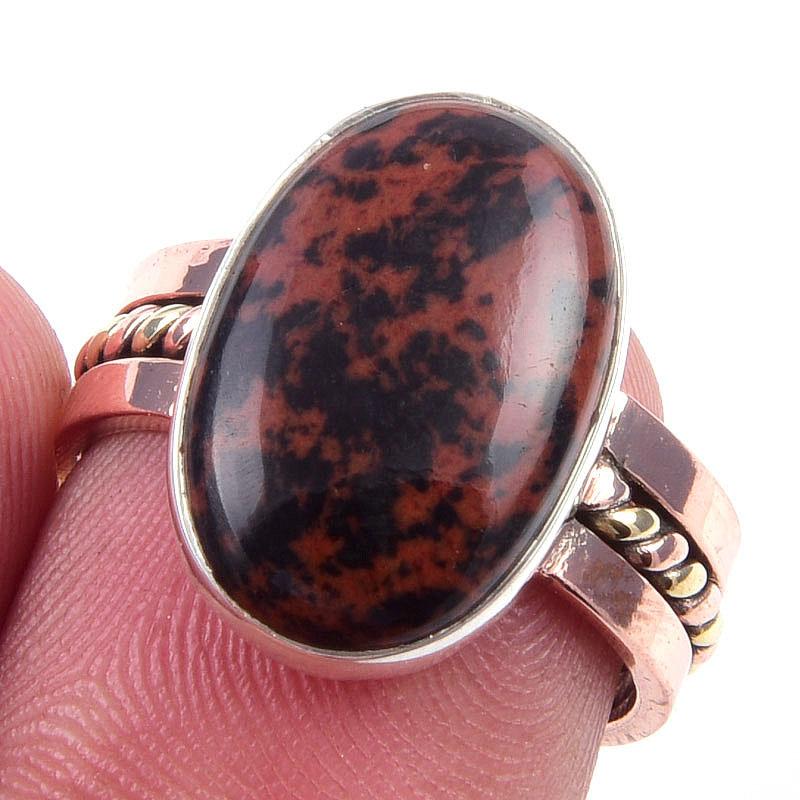Натуральный Махагоновый Обсидиан Драгоценный Камень 925 Стерлинговое Серебро Двухцветное Кольцо Р.6.5 s0u78
