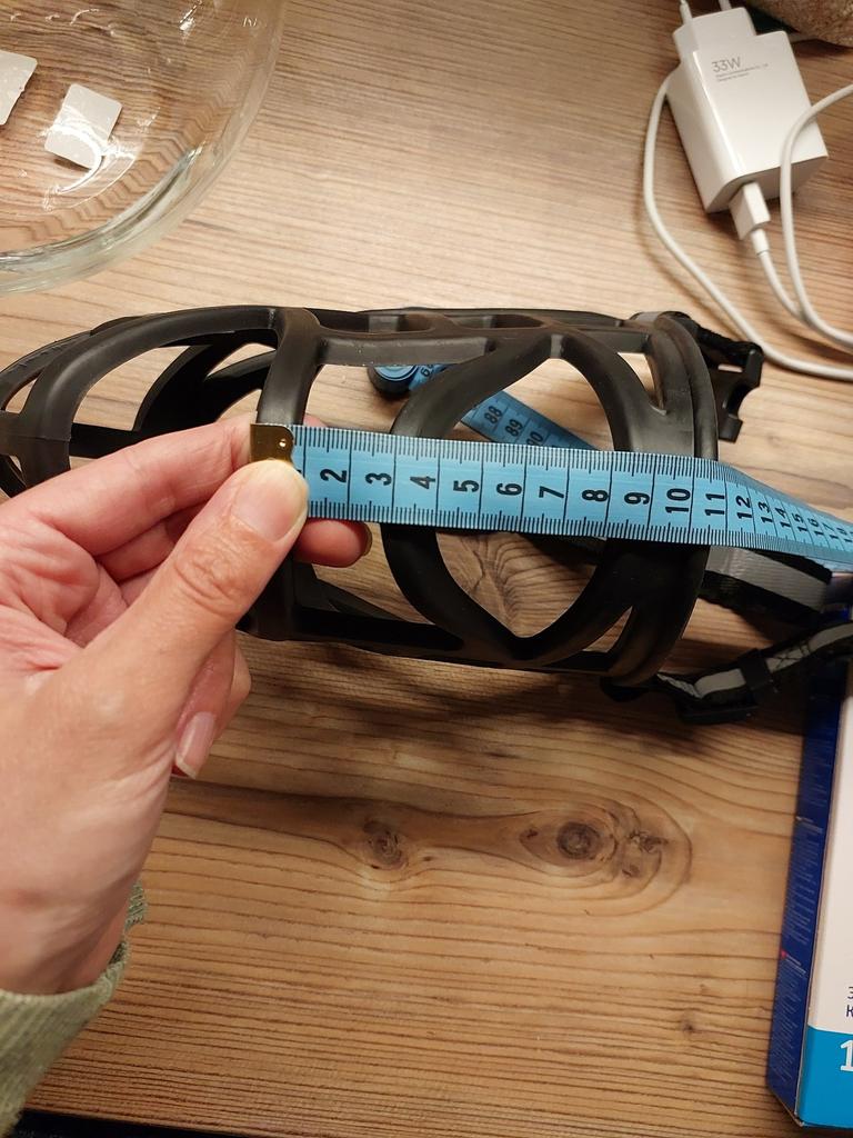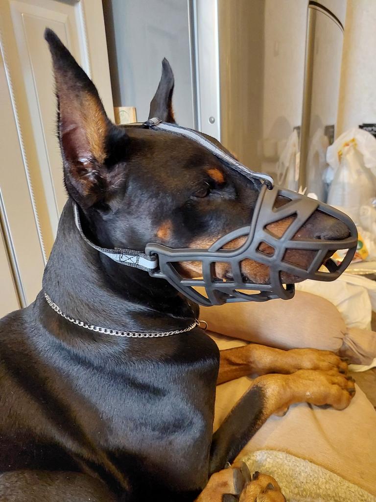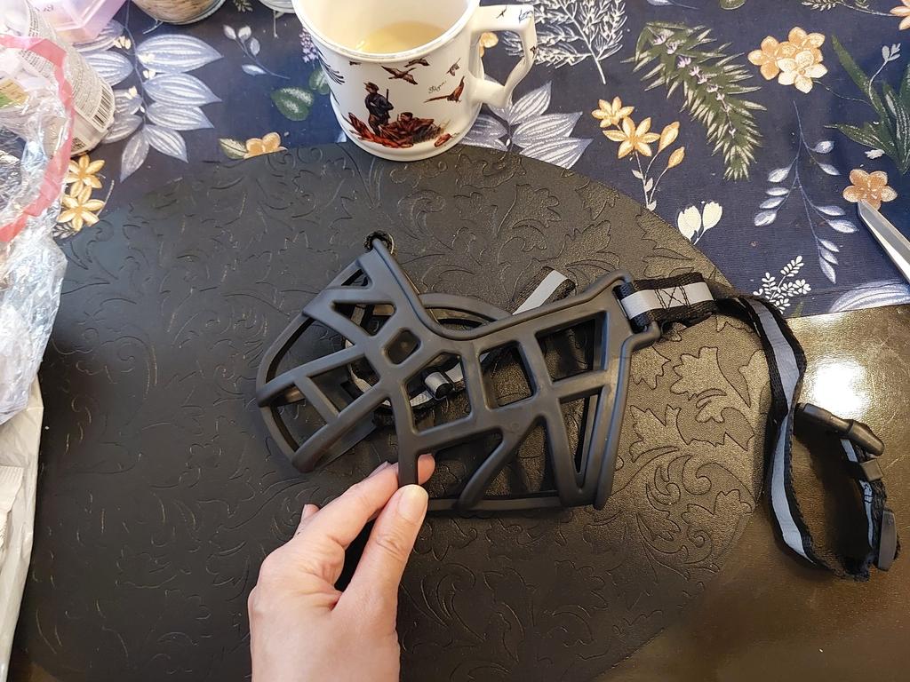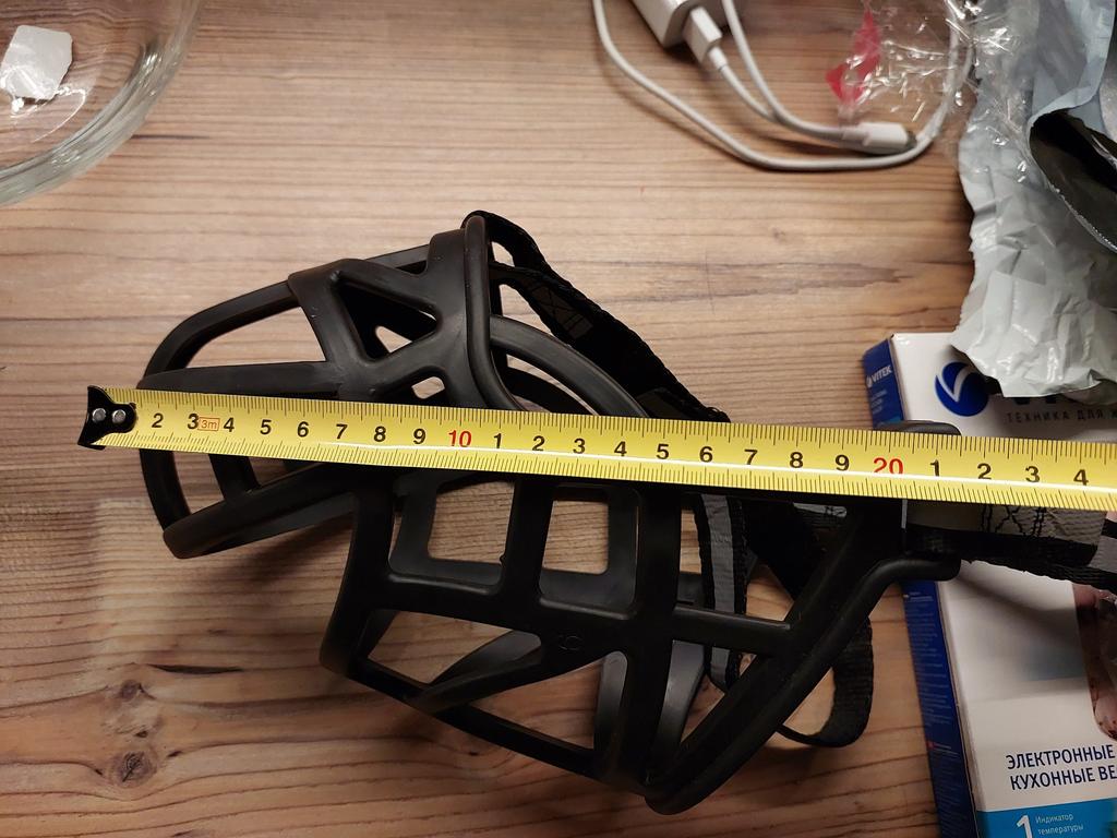 Длина морды нашей собаки 11см,объём 29см. Специально брали побольше,чтобы было свободнее в носке (иначе пёс сильно натирает себе губы). Затылочные ремни придётся немного укоротить. Сам намордник довольно таки толстенький,широкие ремни.