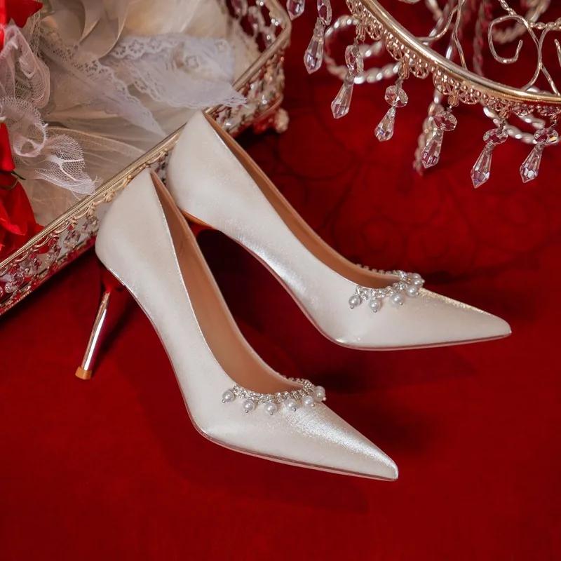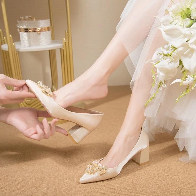 Новое поступление, модные женские туфли с острым носком, пикантные туфли-лодочки с жемчужными бусинами, бежевые туфли на толстом каблуке, элегантные туфли подружки невесты на шпильке