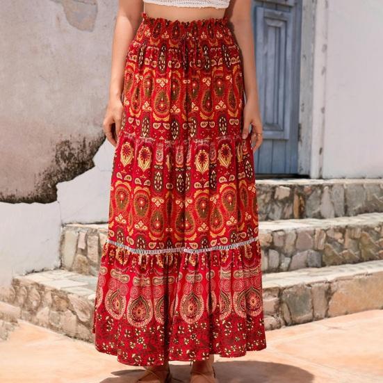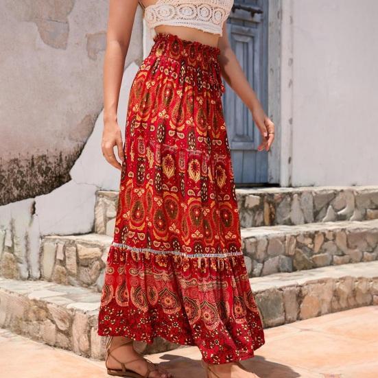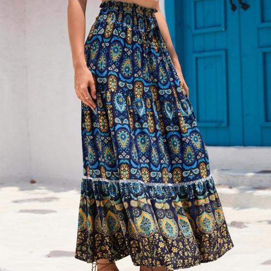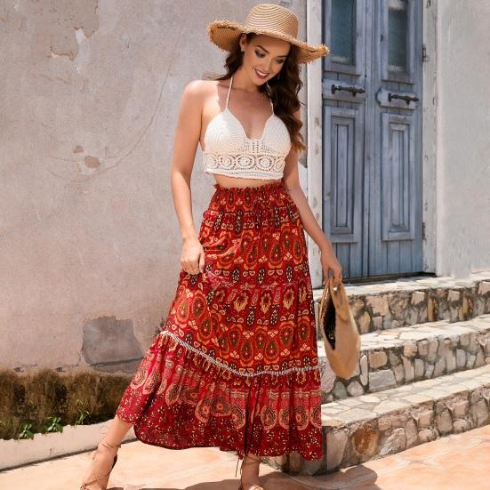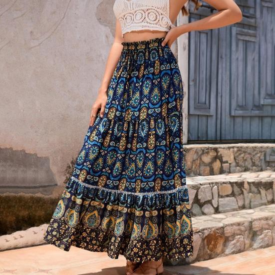 Характеристики: Эластичная высокая талия, трапециевидный силуэт, большой подол, стиль бохо