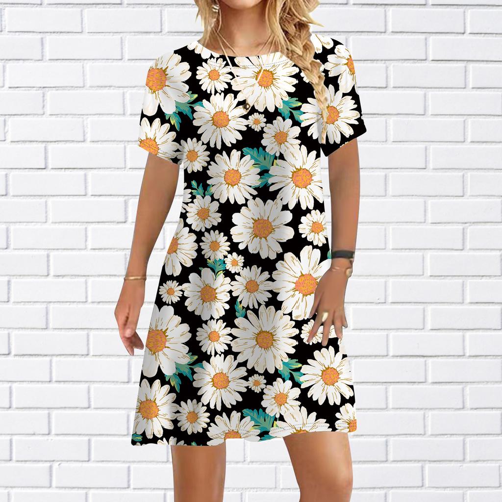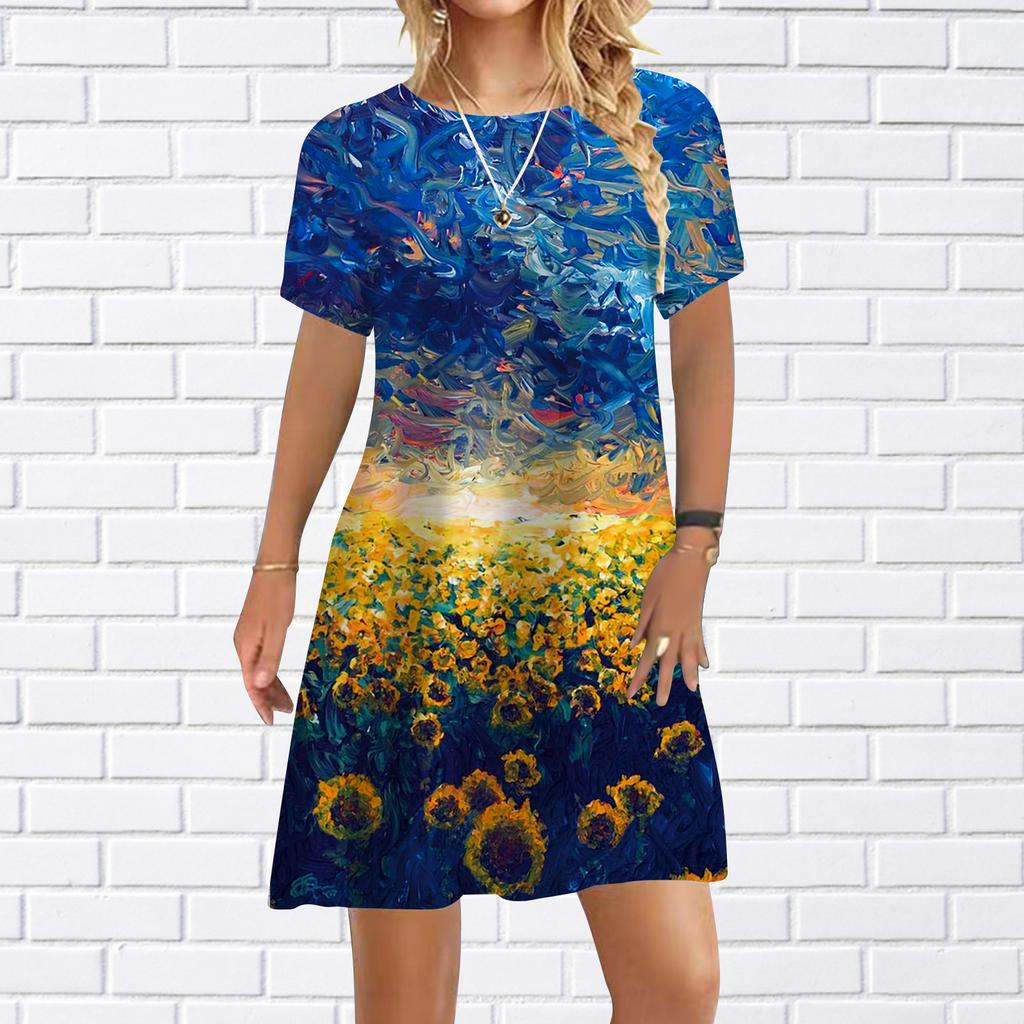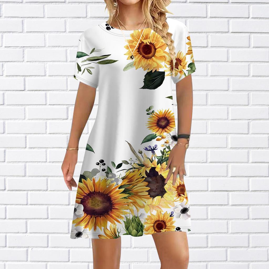 Женское повседневное платье, летние платья с принтом граффити и подсолнухами для женщин, платье с коротким рукавом и круглым вырезом, большие размеры
