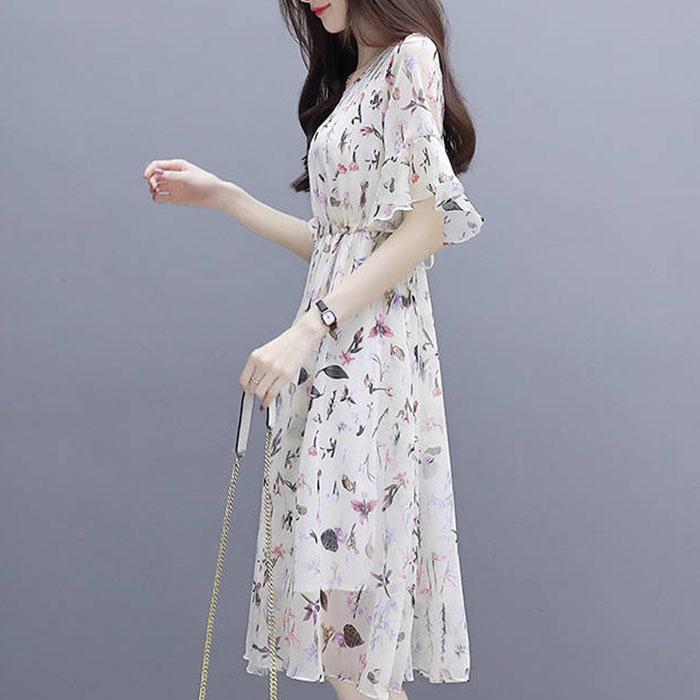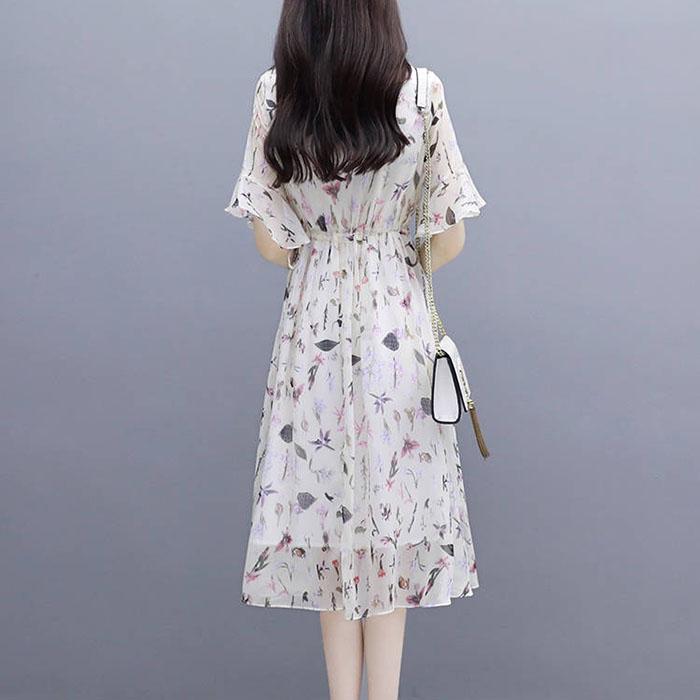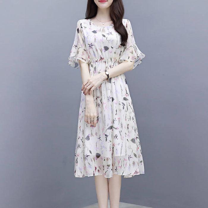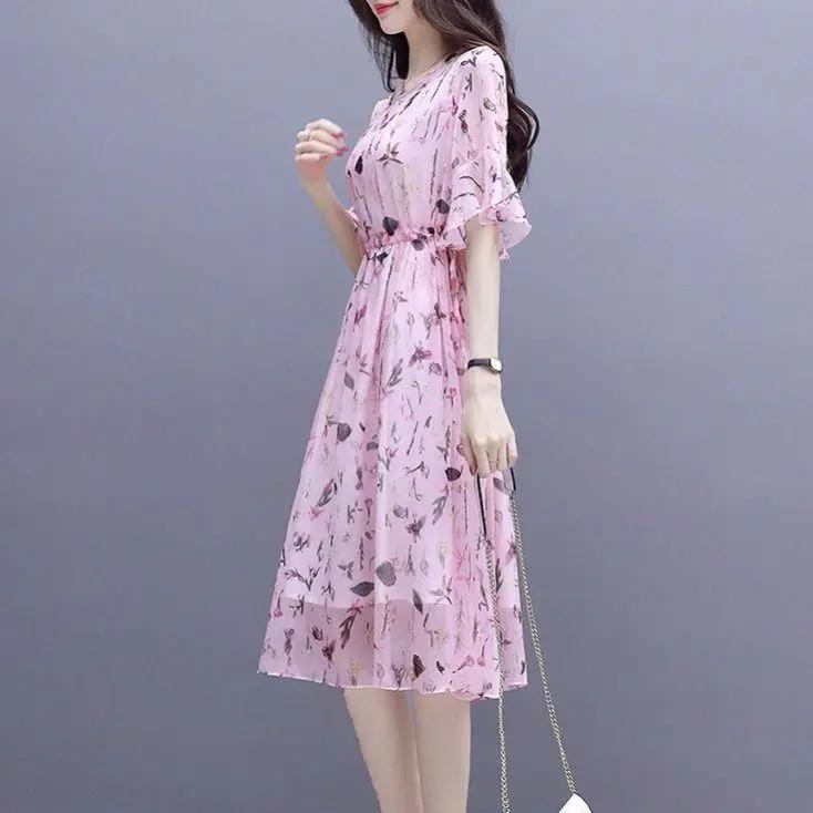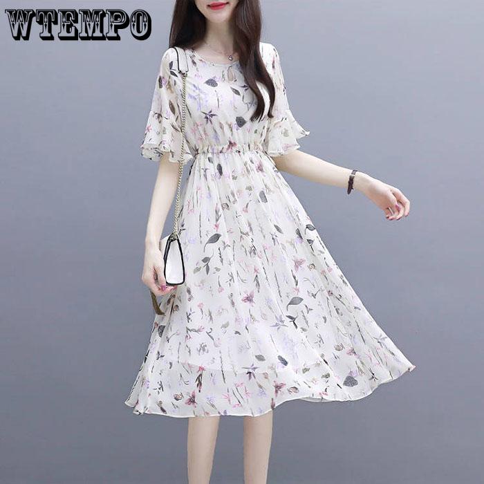 S-2XL женское шифоновое платье с принтом, тонкая пляжная юбка трапециевидной формы с короткими рукавами и круглым вырезом для отдыха