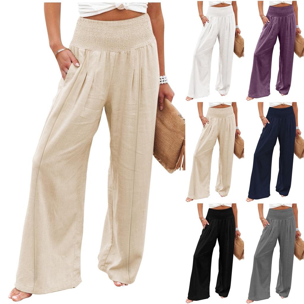 Летние хлопковые льняные широкие брюки, женские свободные брюки-палаццо, повседневные брюки с карманами и эластичной резинкой на талии, пуговицы — купить товар онлайн с бесплатной доставкой по всему миру!