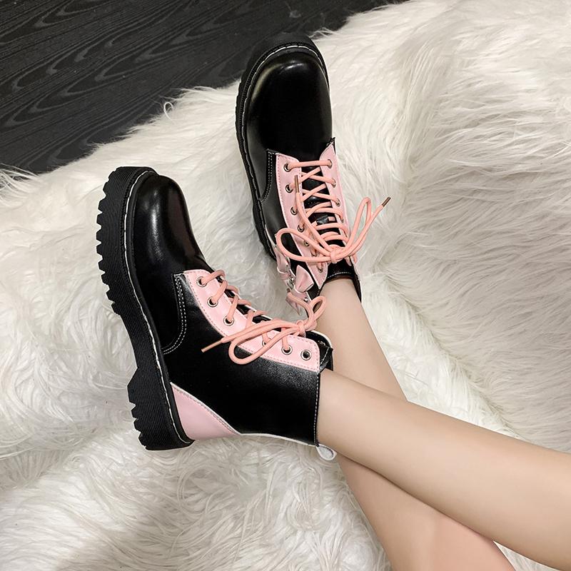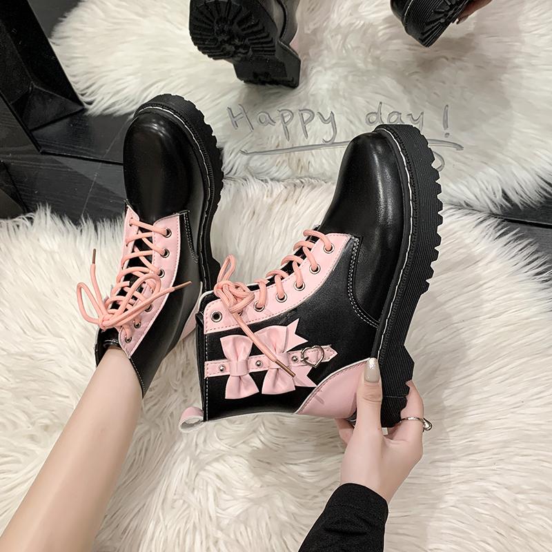 Розовые сапоги Kawaii для девочек, новые женские ботинки с узлом-бабочкой, мотоциклетные ботинки с высоким берцем на шнуровке, модная студенческая обувь на платформе