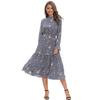 Шифоновое синее платье с цветочным принтом, круглым вырезом, длинными рукавами, листом лотоса, эластичной резинкой на талии, трапециевидной формы средней длины, женское