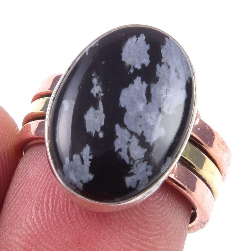 Натуральный Обсидиан Снежный Камень Серебро 925 пробы Двухцветное Кольцо Р.6 q2q36