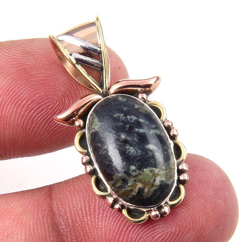 Натуральный зеленый питерсит драгоценный камень 925 стерлинговое серебро двухцветный кулон 1.25" B7d89
