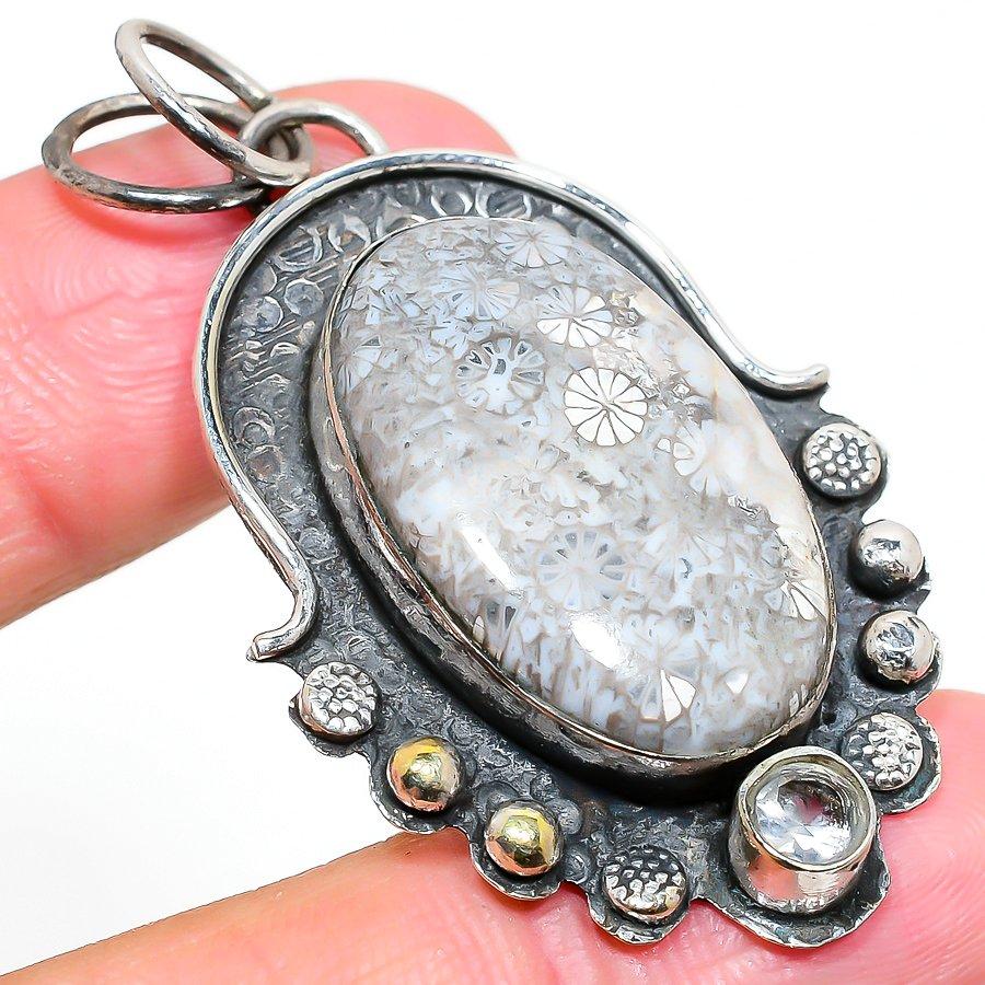 Подвеска из натурального ископаемого коралла и топаза из стерлингового серебра 925 пробы 2,17 дюйма g2T62