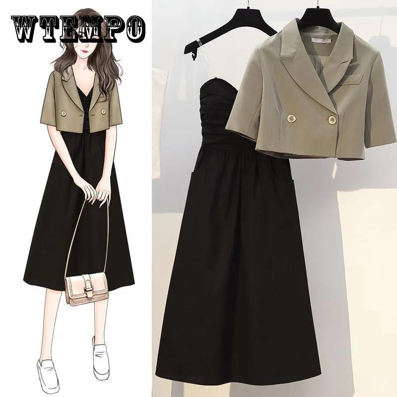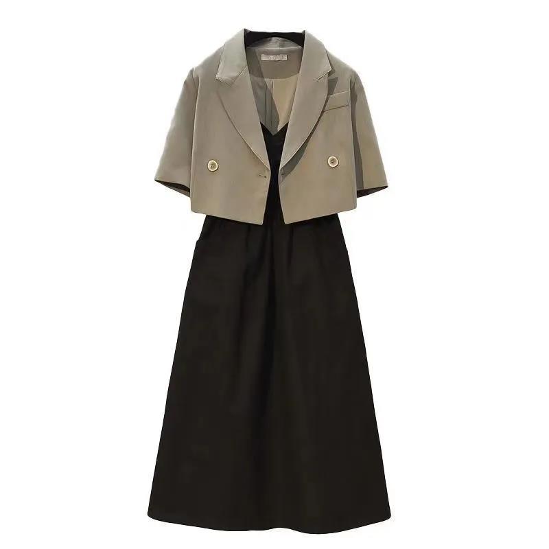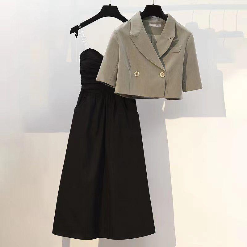 Костюм-двойка, тонкое пальто + сексуальное платье на подтяжках, женский простой пригородный костюм, повседневный сплошной цвет, короткое тонкое пальто, новая новая мода