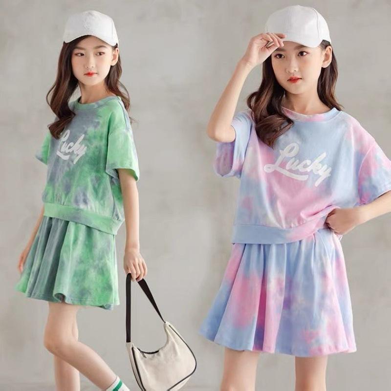 Костюмы для девочек с принтом тай-дай, летняя корейская версия, большие дети, маленькие девочки, юбки с короткими рукавами, шорты, тренд из двух предметов