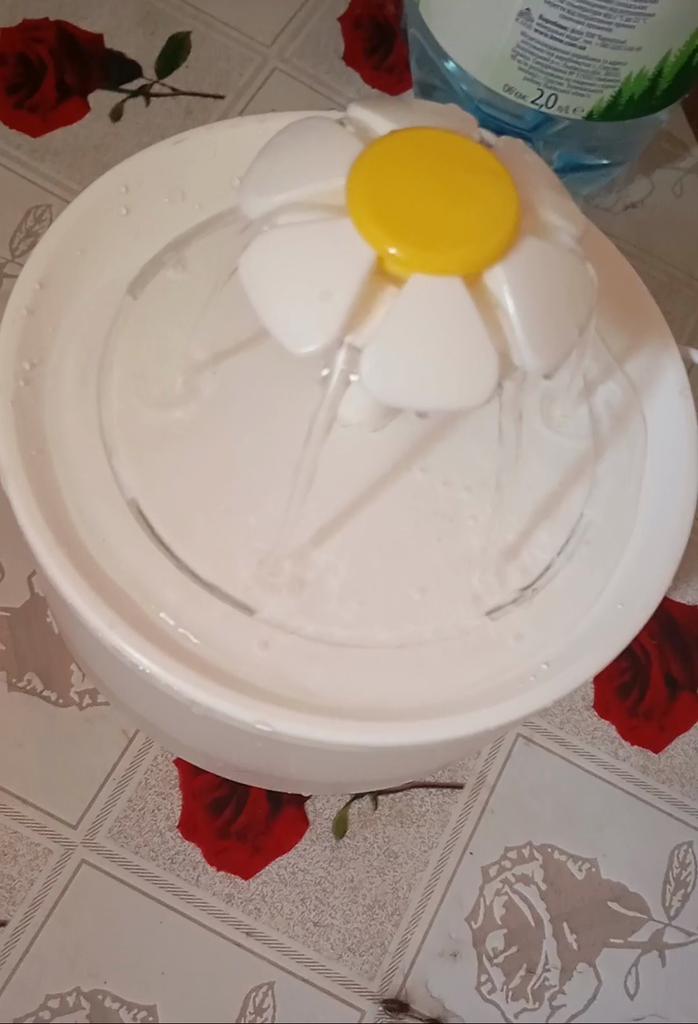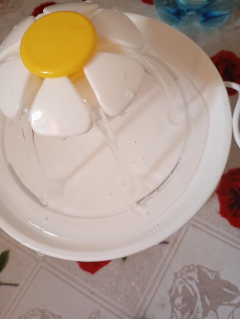 Новенький фонтанчик😺💦 Года 4 назад покупала фонтан для Фиджи, но со временем он поизносился. Купила новый. Меньше по объему и попроще с виду, но с такой же "ромашкой", к какой привык наш котик💦 ☀️Фонтан портативный, много места не занимает 💦В комплекте сама чаша, моторчик-насос со шнуром, 4 ножки, ромашка-рассеиватель воды, два кусочка скотча - видимо, чтобы прикреплять шнур к стене ☀️Насос с присосками, крепится ко дну, потом надо попасть трубочкой в насос, закрыть крышку и сверху надеть цветок 💦Работает тихо Адаптера с вилкой в комплекте нет, у нас остался от прошлого фонтана. Фиджи нравится, и нам тоже😸 Удачных покупок💋