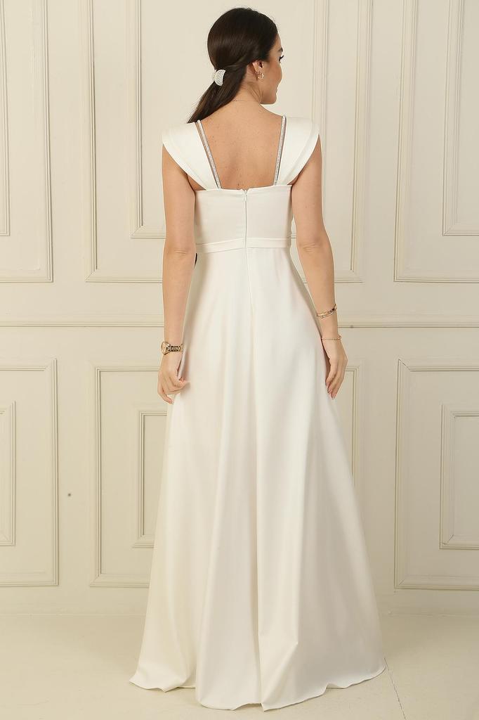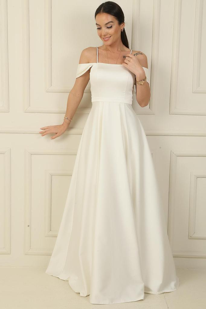 Длинное атласное платье с квадратным вырезом и подкладкой на бретельках и камнями