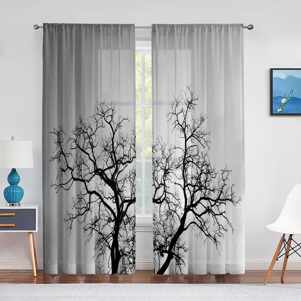 Серые тюлевые вуали с принтом ветвей деревьев для спальни, оконные занавески для гостиной, прозрачные шторы, жалюзи, шторы из органзы