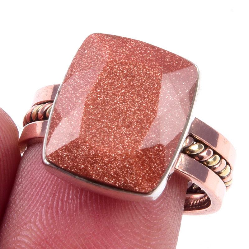 Двухцветное кольцо ручной работы из стерлингового серебра 925 пробы с натуральным солнечным камнем, размер 8 Z3M56