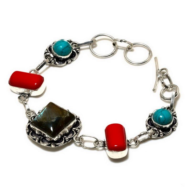 Ювелирный браслет из лабрадорита, красного коралла 925 пробы с посеребренным покрытием, 6–8 дюймов