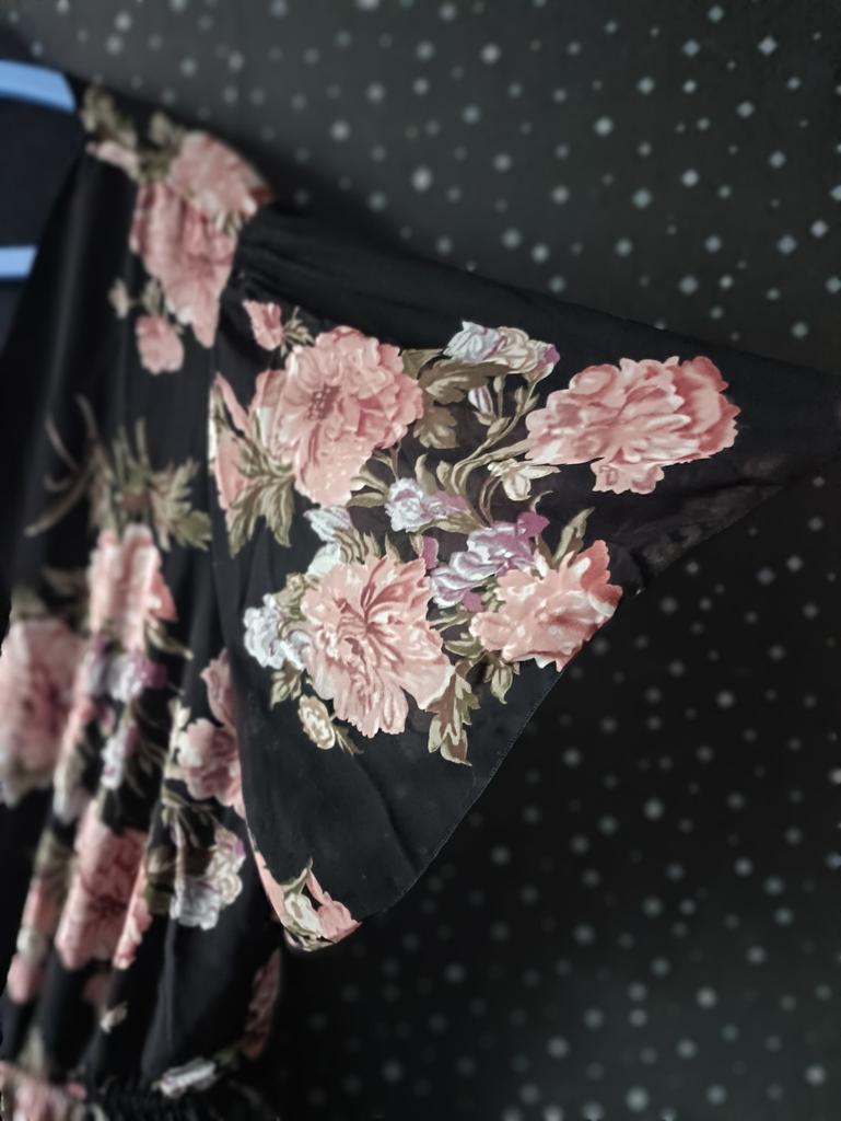 Шифоновое платье! Ткань отличная -тонкая, легкая; не электризуется, не мнется; полупрозрачная. Принт красивый, цветочный. Есть подкладка, она черного цвета и хорошей длины. Фасон достаточно свободный, но при этом талия обозначена. В талию вшита резинка. Есть длинный пояс из той же ткани, что и платье. Рукава короткие, широкие, колокольчиком. Подойдут на руку любой полноты. Вырез У-образный, довольно широкий. Я его застегнула брошкой, а то вся душа наружу 😁 Платье свободное, лёгкое, женственное. Летом в нем будет приятно. Размер 4xl сидит одинаково хорошо как на мне, 120/114/135, так и на дочке 90/82/117.