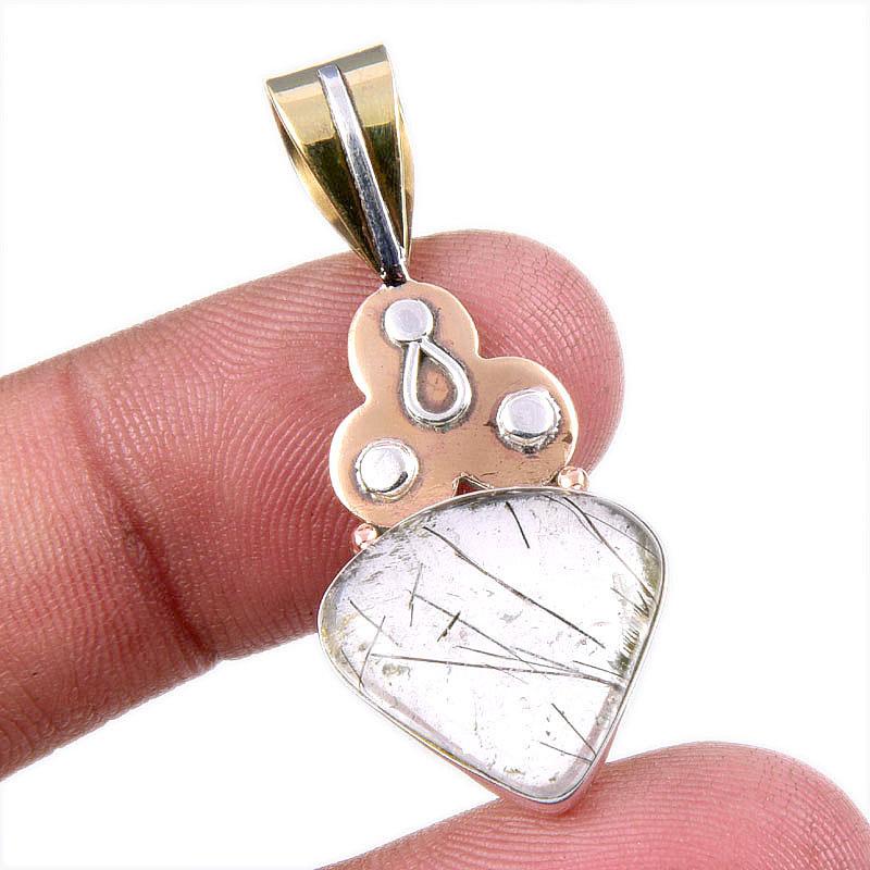 Natural Black Rutile 925 Solid Sterling Silver TwoTone Gift Pendant 1.75" l8A00