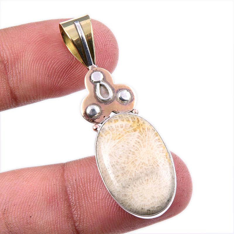 Подвеска из натурального ископаемого коралла из стерлингового серебра 925 пробы в двухцветном исполнении 1,75 дюйма M0L05
