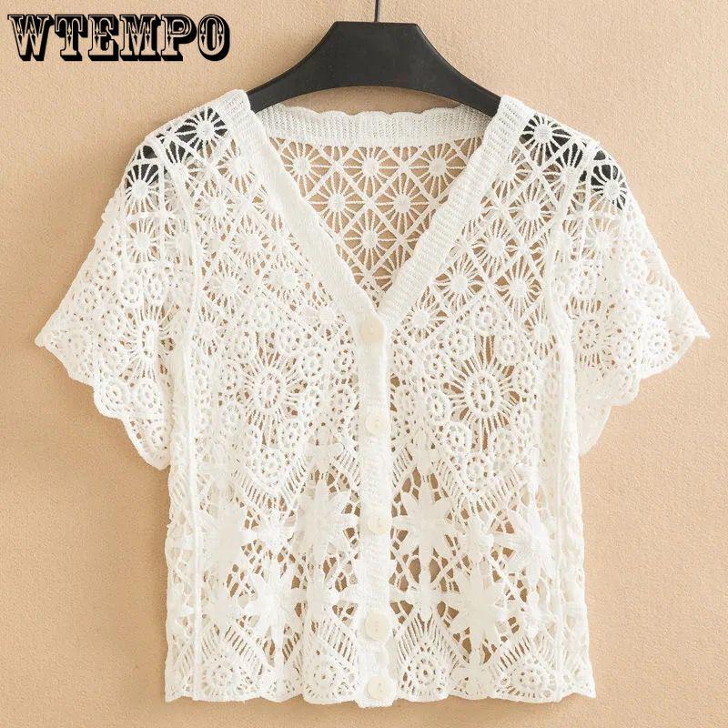 Женский новый универсальный ажурный кардиган, летняя свободная рубашка с v-образным вырезом и солнцезащитным кремом на пуговицах, повседневная верхняя одежда, сетчатый ленивый топ с длинными рукавами