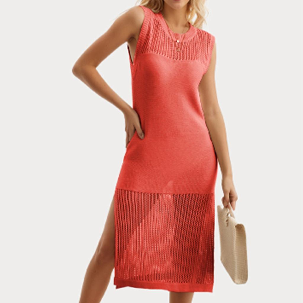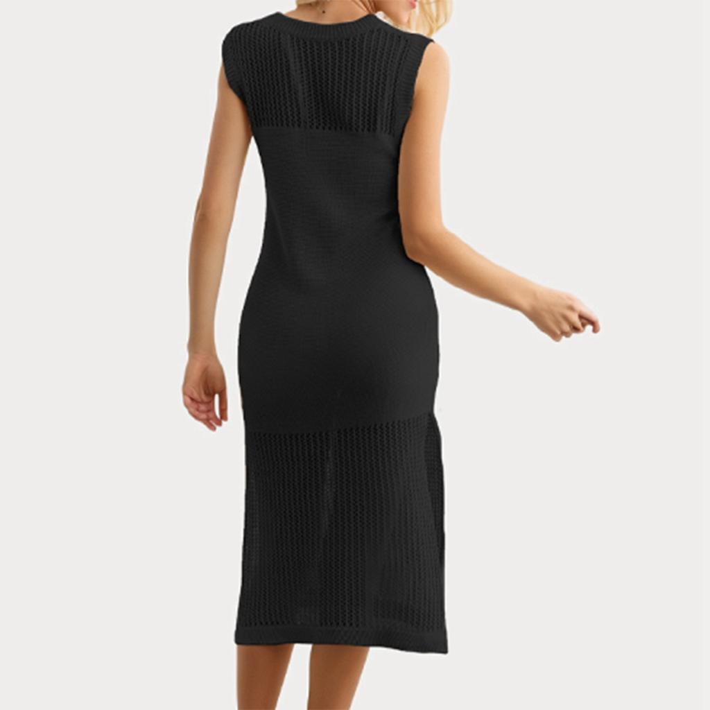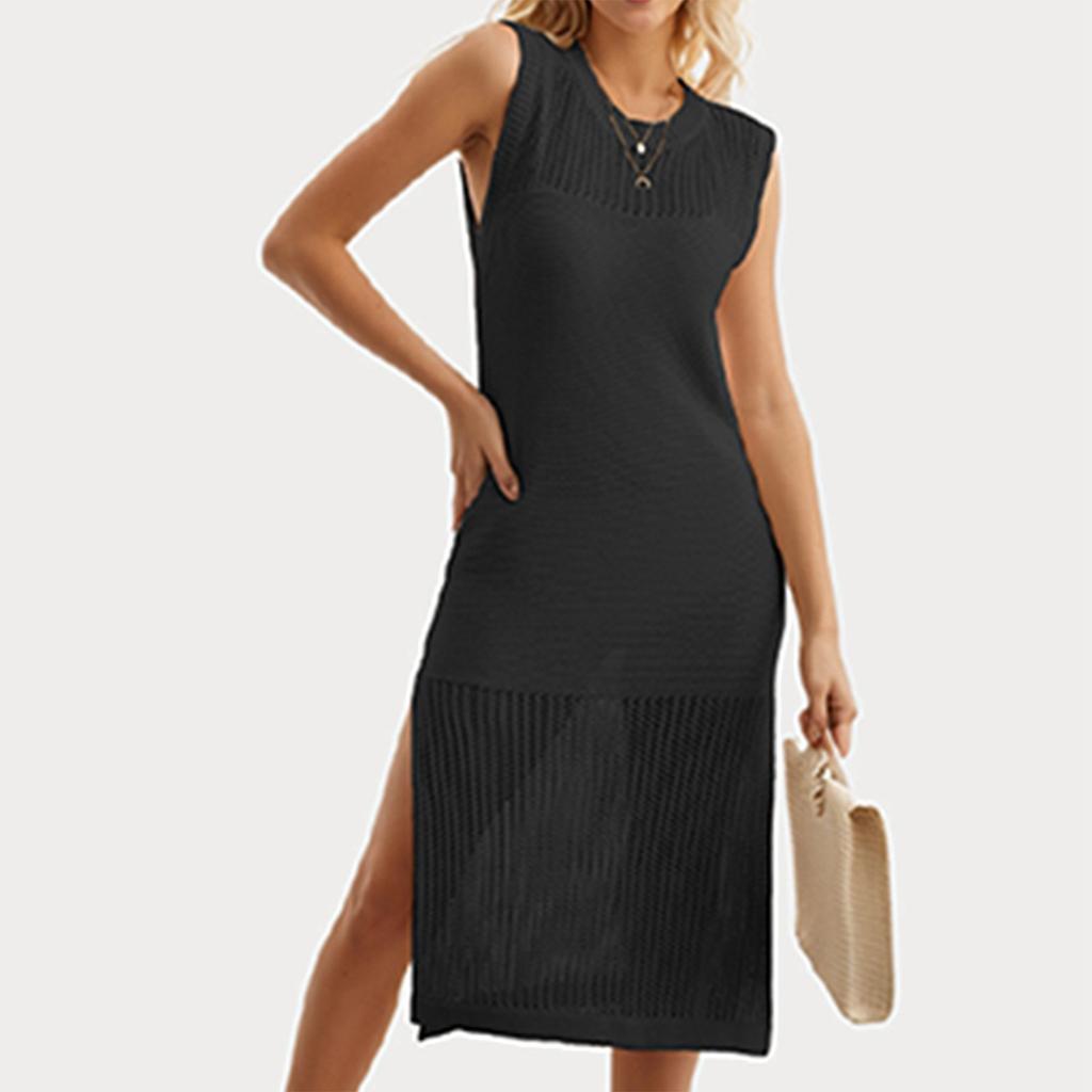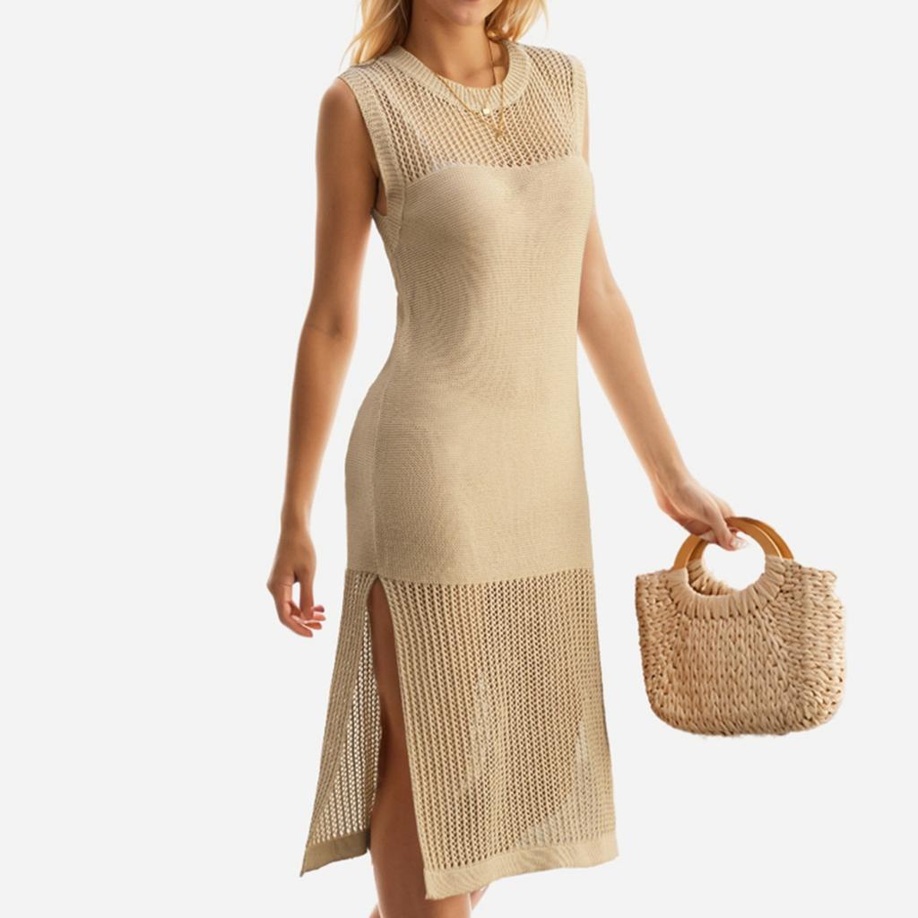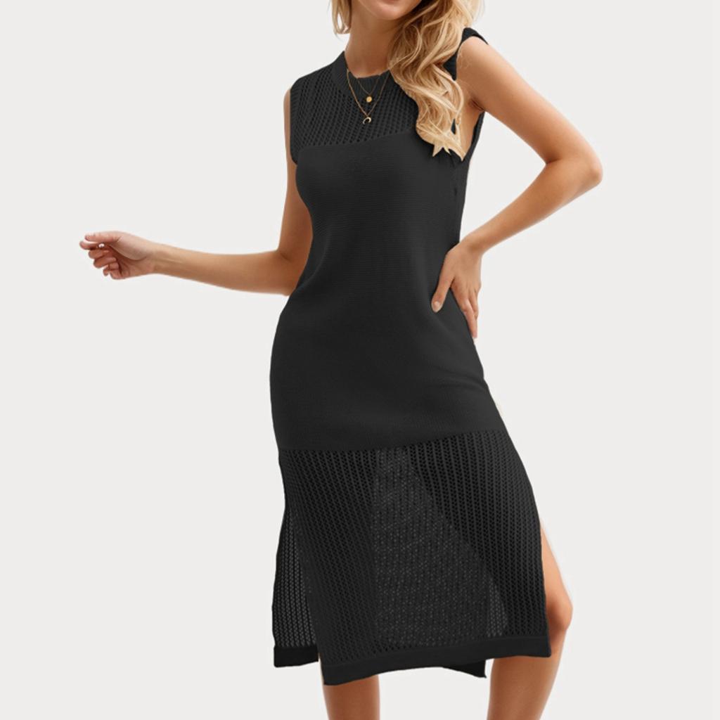 Женский купальник, накидка, вязаные крючком платья, длинное платье без рукавов с круглым вырезом, пляжное платье миди с разрезом по бокам