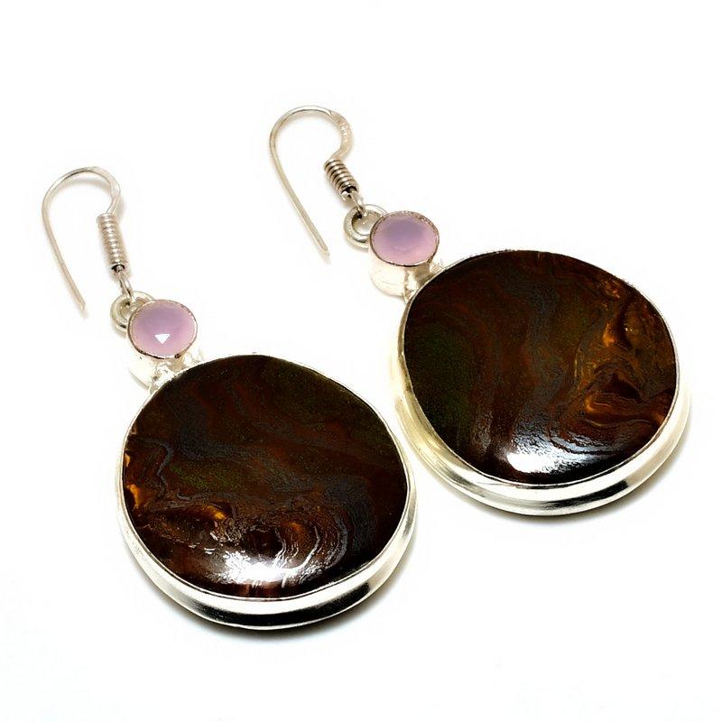 Серьги «Железный тигровый глаз» с розовым халцедоном, посеребренные 925 пробы, 2,08 дюйма