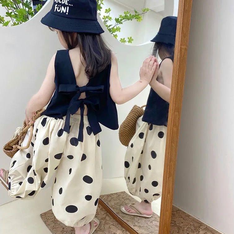 Детский костюм, летняя одежда, тонкий жилет с бабочкой и росой на спине для девочек, повседневные брюки без рукавов, брюки-фонарики, широкие брюки, корейский комплект из двух предметов