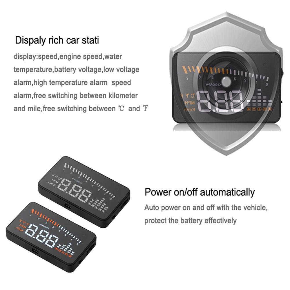 Этот продукт предназначен для безопасности водителей, особенно при высокоскоростном вождении в ночное время, HUD может держать взгляд водителя на дороге и может уменьшить автомобильную аварию. HUD может проецируемую важную информацию (например, скорость) на лобовое стекло, это может помочь неопытным новичкам контролировать свою скорость и избежать нарушения скоростного режима на дороге ограничения скорости. Что еще более важно, это позволяет водителю мгновенно считывать число в отличном видении и всегда заставлять водителей смотреть на дорогу в ясном уме.