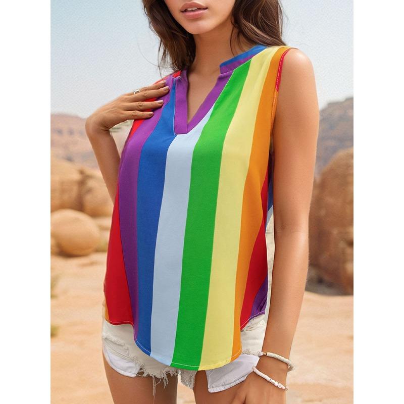 Летняя женская рубашка без рукавов, красочная полосатая блузка с v-образным вырезом