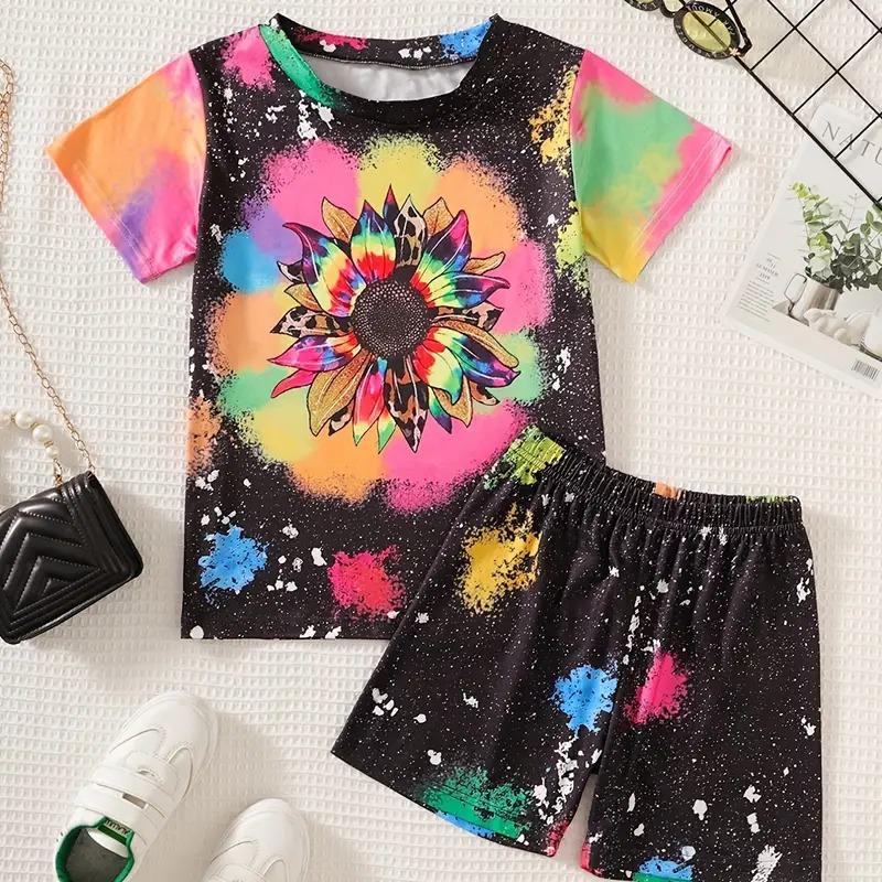 Летняя повседневная футболка с короткими рукавами и шортами для девочек с граффити и подсолнухом, комплект из 2 предметов, детская одежда