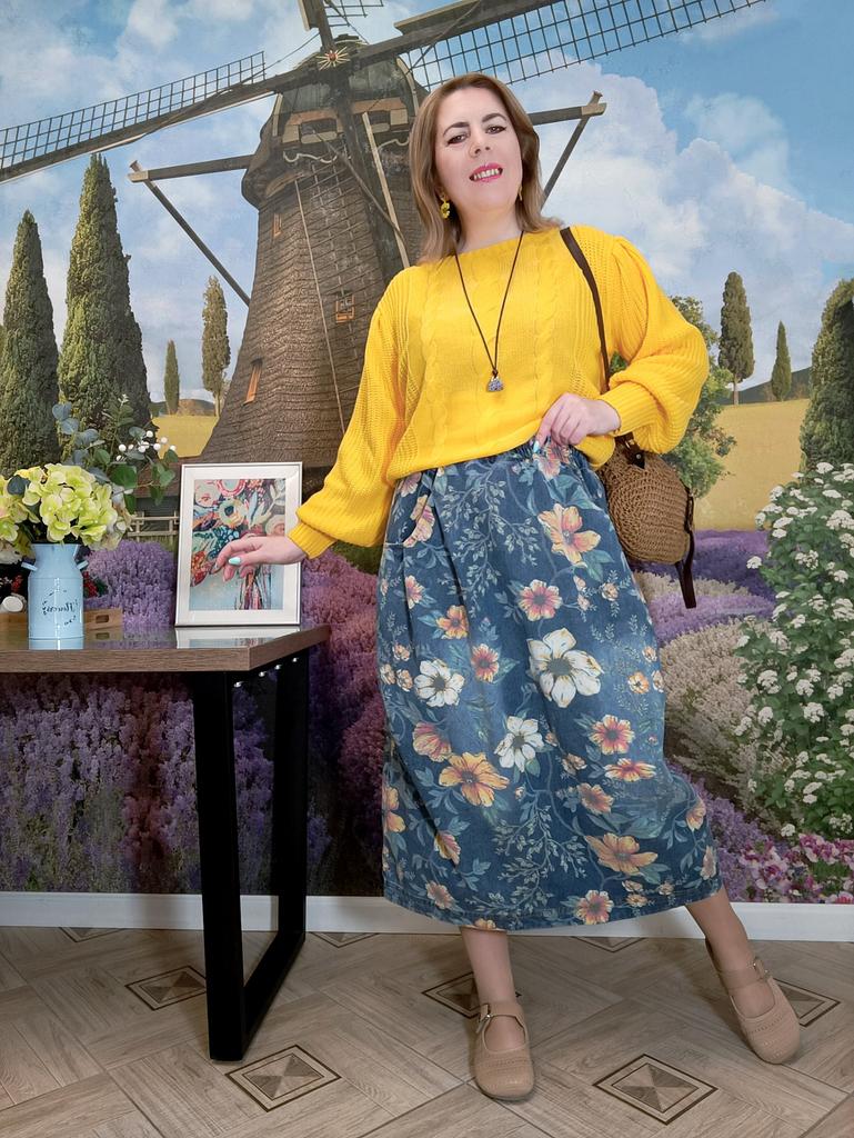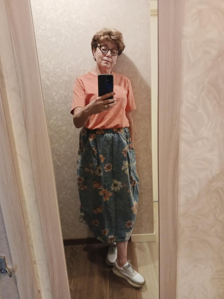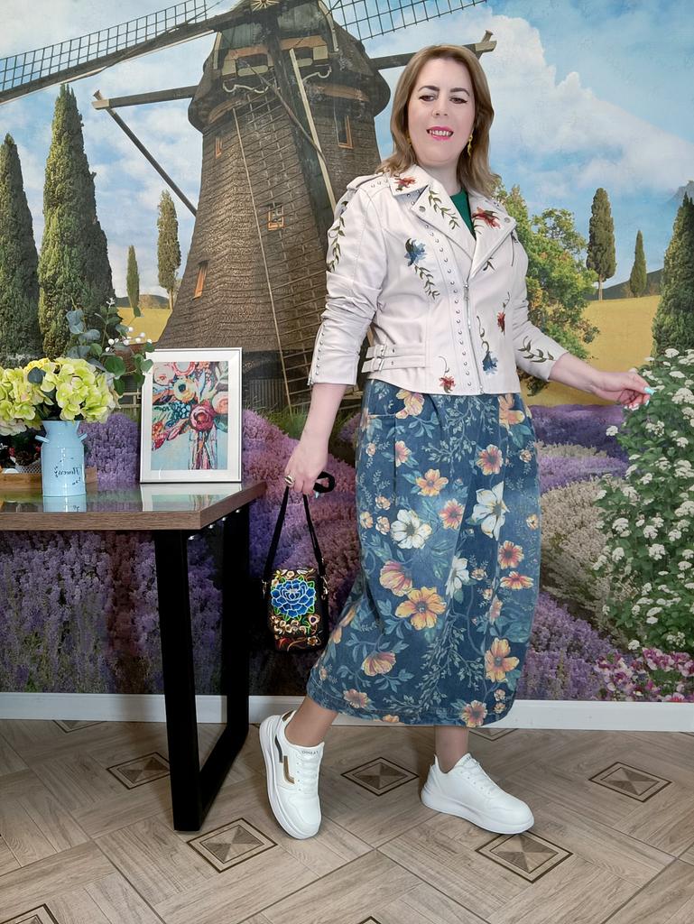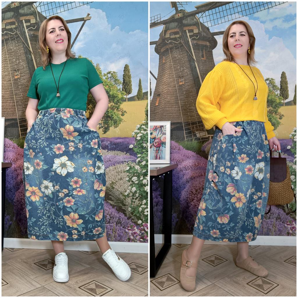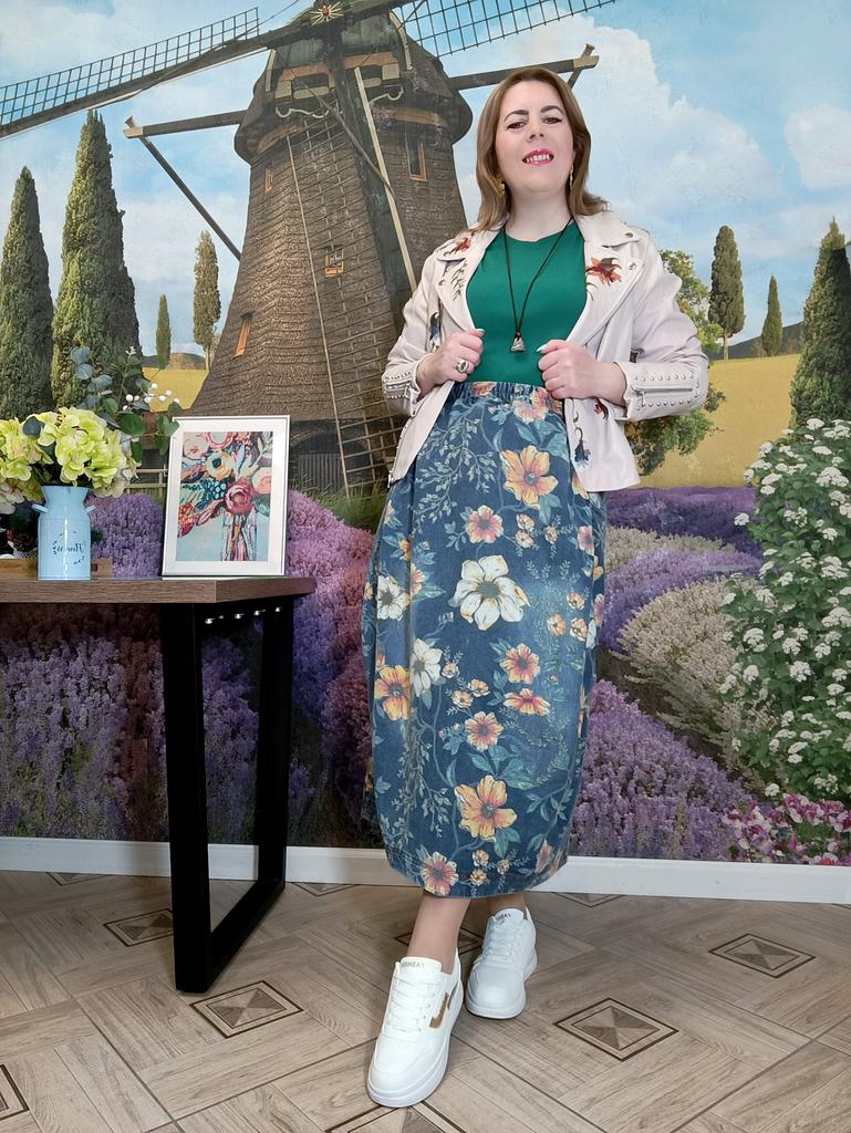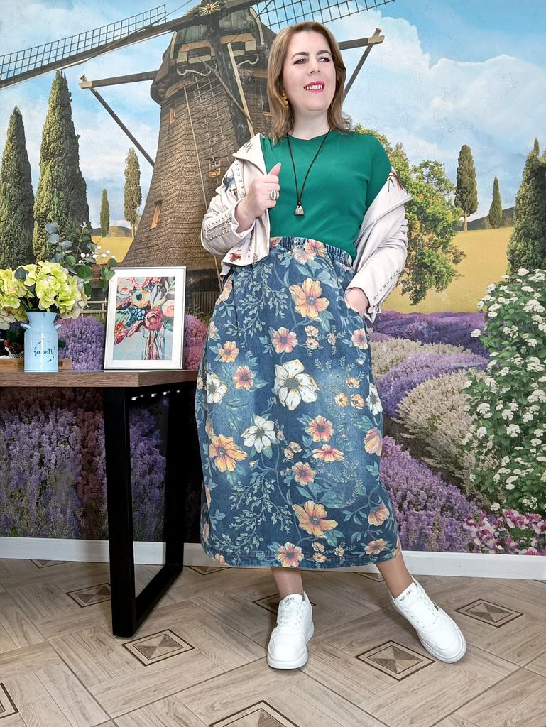 Джинсовая юбка "Цветочная поляна" 🌸🌿 Привет 👋 Вот разные джинсовые юбки у меня были, но эта особенно выделяется своим дизайном и фасоном! Помимо того, что она такая вся весенняя , усыпана цветами и в любое время года создаст летнее настроение; она ещё прошита так, чтобы смотреться фонариком. Да, рукава-фонарики мы все с вами знаем, а вот юбка... Юбка тоже бывает, оказывается. Все по тому же принципу - сделаны защипы на ткани, в данном случае по бокам с двух сторон, чуть ниже кармашков, с каждой стороны по два На карманах, кстати, Толе по два защипа. Карманы удобные и грубокие. На талии широкая резинка. Сзади два нашивных кармана, как на джинсах - один с принтом, другой без - выглядит интересно. Вернёмся к защипами - благодаря такому приёму юбка смотрится более пышной, снизу чуть ниже, чем сзади. Она спереди визуально словно сужается к низу. Для удобства сзади есть небольшой вырез. Ещё по низу ткань загнута широкой полоской и прострочена, поэтому низ держит форму. Кому-то нравится такая форма, кому- то нет, а я считаю, что в этом изюминка данной юбки. Она крутая и не сразу разгадает,в чем секрет. Цветы - это не наклейки, а краска по ткани. Все выполнено качественно и ничего с ними после стирки не будет. ✓Ткань здесь настоящая джинса - хлопок, не тянется, плотная, но мягкая. ✓Пошив фабричный. Расцветка одна. Размеры: M - XXL На мне максимальный размер. Стоит комфортно, не спадает, подойдёт и на бо́льшие параметры. Мой рост 173см. Параметры: 97/89/110 Размер одежды 50 -52 Замеры в размере XXL: 📏длина 81/87см 📏ОТ 76- 106см 📏ОБ 140см Крутая джинсовая юбка! Подойдёт на любой сезон. Дизайн необычный, принт радует глаз. Рекомендую, девочки ✅ #elena_likui #Alyaboomty #юбка_деним