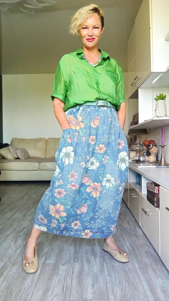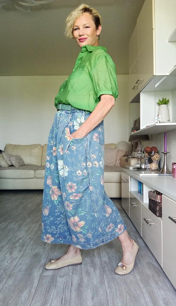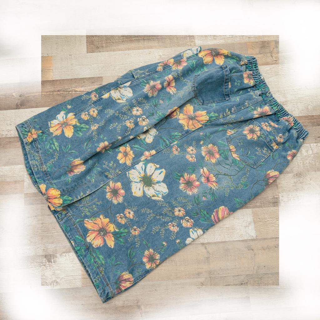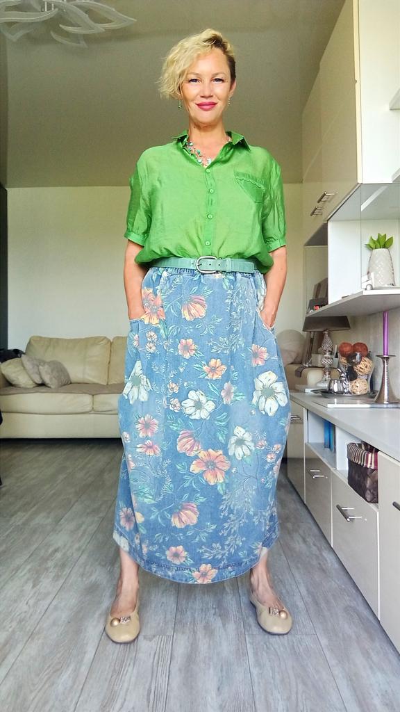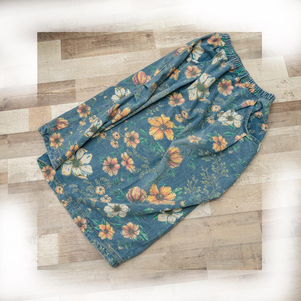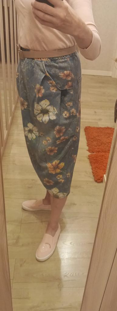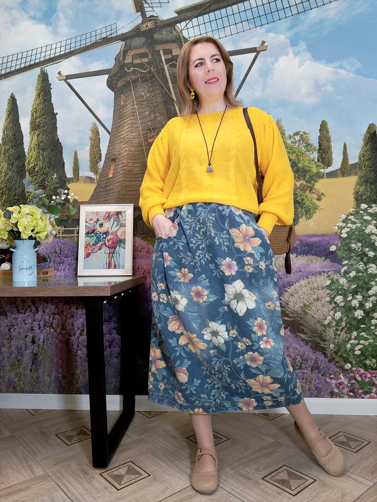 Джинсовая юбка "Цветочная поляна" 🌸🌿 Привет 👋 Вот разные джинсовые юбки у меня были, но эта особенно выделяется своим дизайном и фасоном! Помимо того, что она такая вся весенняя , усыпана цветами и в любое время года создаст летнее настроение; она ещё прошита так, чтобы смотреться фонариком. Да, рукава-фонарики мы все с вами знаем, а вот юбка... Юбка тоже бывает, оказывается. Все по тому же принципу - сделаны защипы на ткани, в данном случае по бокам с двух сторон, чуть ниже кармашков, с каждой стороны по два На карманах, кстати, Толе по два защипа. Карманы удобные и грубокие. На талии широкая резинка. Сзади два нашивных кармана, как на джинсах - один с принтом, другой без - выглядит интересно. Вернёмся к защипами - благодаря такому приёму юбка смотрится более пышной, снизу чуть ниже, чем сзади. Она спереди визуально словно сужается к низу. Для удобства сзади есть небольшой вырез. Ещё по низу ткань загнута широкой полоской и прострочена, поэтому низ держит форму. Кому-то нравится такая форма, кому- то нет, а я считаю, что в этом изюминка данной юбки. Она крутая и не сразу разгадает,в чем секрет. Цветы - это не наклейки, а краска по ткани. Все выполнено качественно и ничего с ними после стирки не будет. ✓Ткань здесь настоящая джинса - хлопок, не тянется, плотная, но мягкая. ✓Пошив фабричный. Расцветка одна. Размеры: M - XXL На мне максимальный размер. Стоит комфортно, не спадает, подойдёт и на бо́льшие параметры. Мой рост 173см. Параметры: 97/89/110 Размер одежды 50 -52 Замеры в размере XXL: 📏длина 81/87см 📏ОТ 76- 106см 📏ОБ 140см Крутая джинсовая юбка! Подойдёт на любой сезон. Дизайн необычный, принт радует глаз. Рекомендую, девочки ✅ #elena_likui #Alyaboomty #юбка_деним