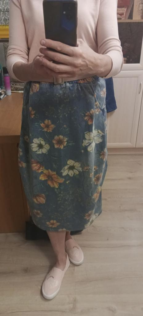 Джинсовая юбка с цветами Насколько я равнодушна к юбкам, но эта заставила меня задуматься - почему я редко ношу юбки? Они ведь бывают такими стильными ! Вот как эта. К сожалению, все очарование и красоту мне показать будет сложно, потому что я неправильно выбрала размер. Обычно, в этом магазине беру размер 2 XL. Но в данной ситуации этого делать не следовало, потому что юбка оказалась для меня слишком большой. Но все же, попробую ее вам показать, и рассказать, что же мне особенно понравилось. Итак, Мои параметры рост 167, 96-82-98. На мне размер 2 XL. Нужно было брать на пару размеров меньше. Очень интересный дизайн. 📌На талии обычная резинка. Не тугая, тянется отлично. А вот по бокам у юбки защипы, и смотрится это , на мой взгляд, крайне эффектно! Низ юбки оторочен куском джинсовой ткани, благодаря чему юбка держит форму. Боковые карманы объемные, от них вниз идут складки. Сзади два накладных кармана, один цветной, другой однотонный. 📌Джинса плотная, не тянется. Ну и конечно, мне нравятся цветы. Они придают юбке особый шарм. Пошив фабричный. 📌Замеры: ОТ 72-110 ОБ 144 Длина 86