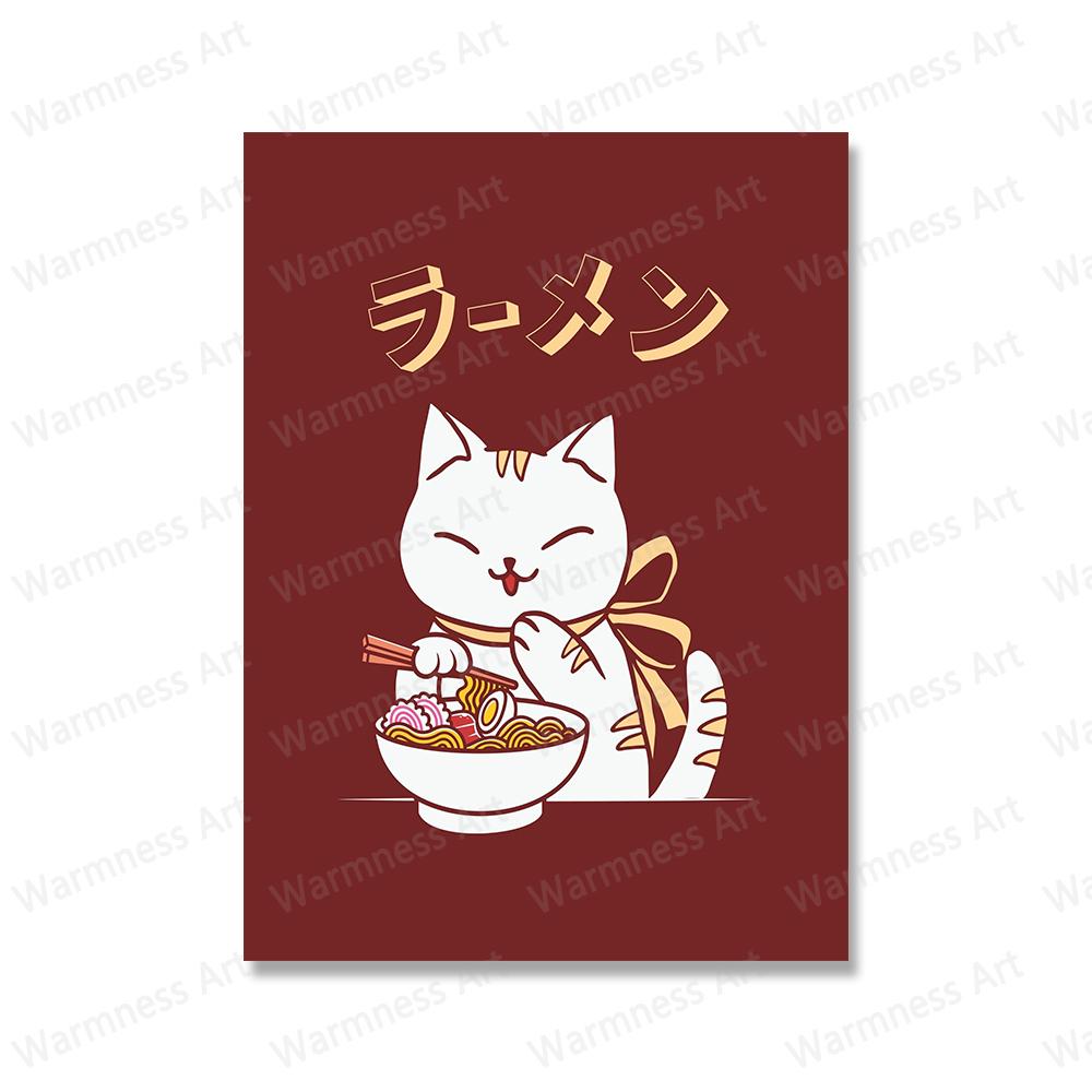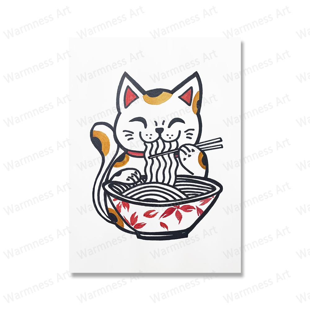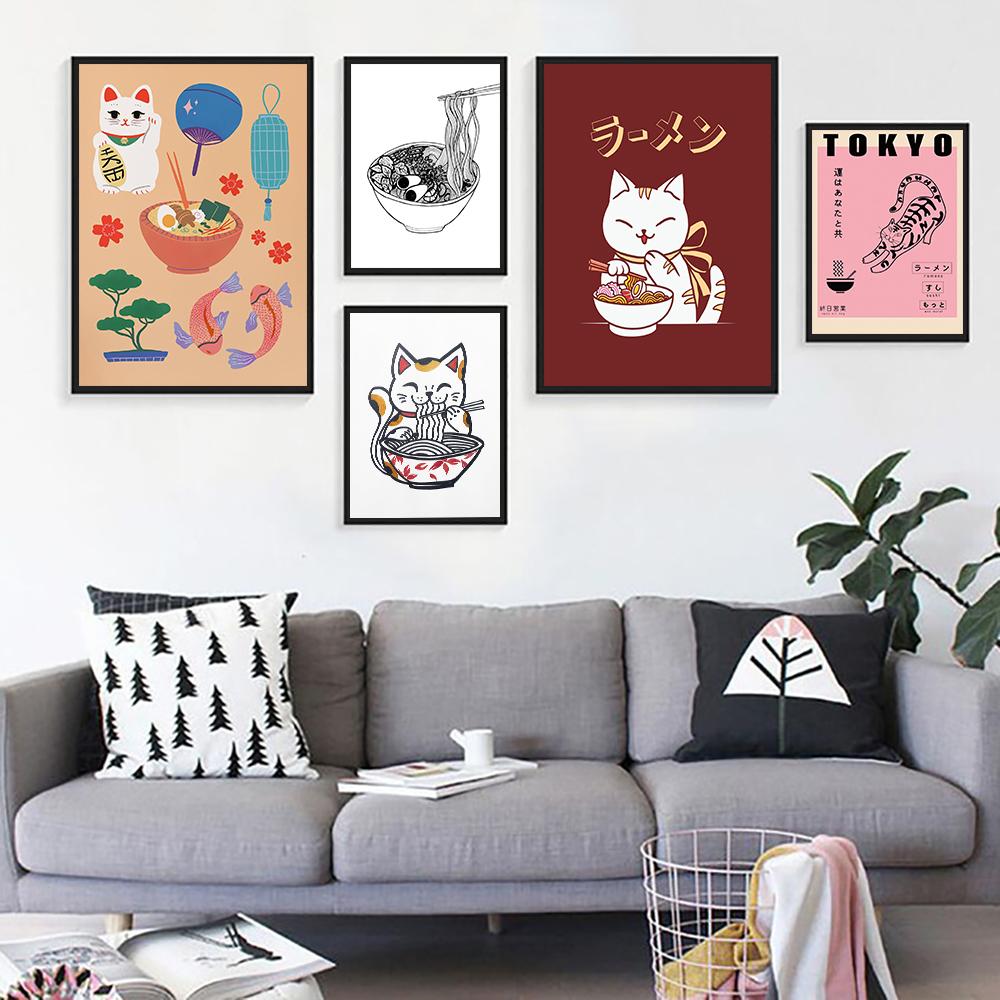 Японский рамэн, холст, картина, животные, счастливые кошки, постеры и принты, лапша, настенные панно с едой для детей, кухонная комната, домашний декор