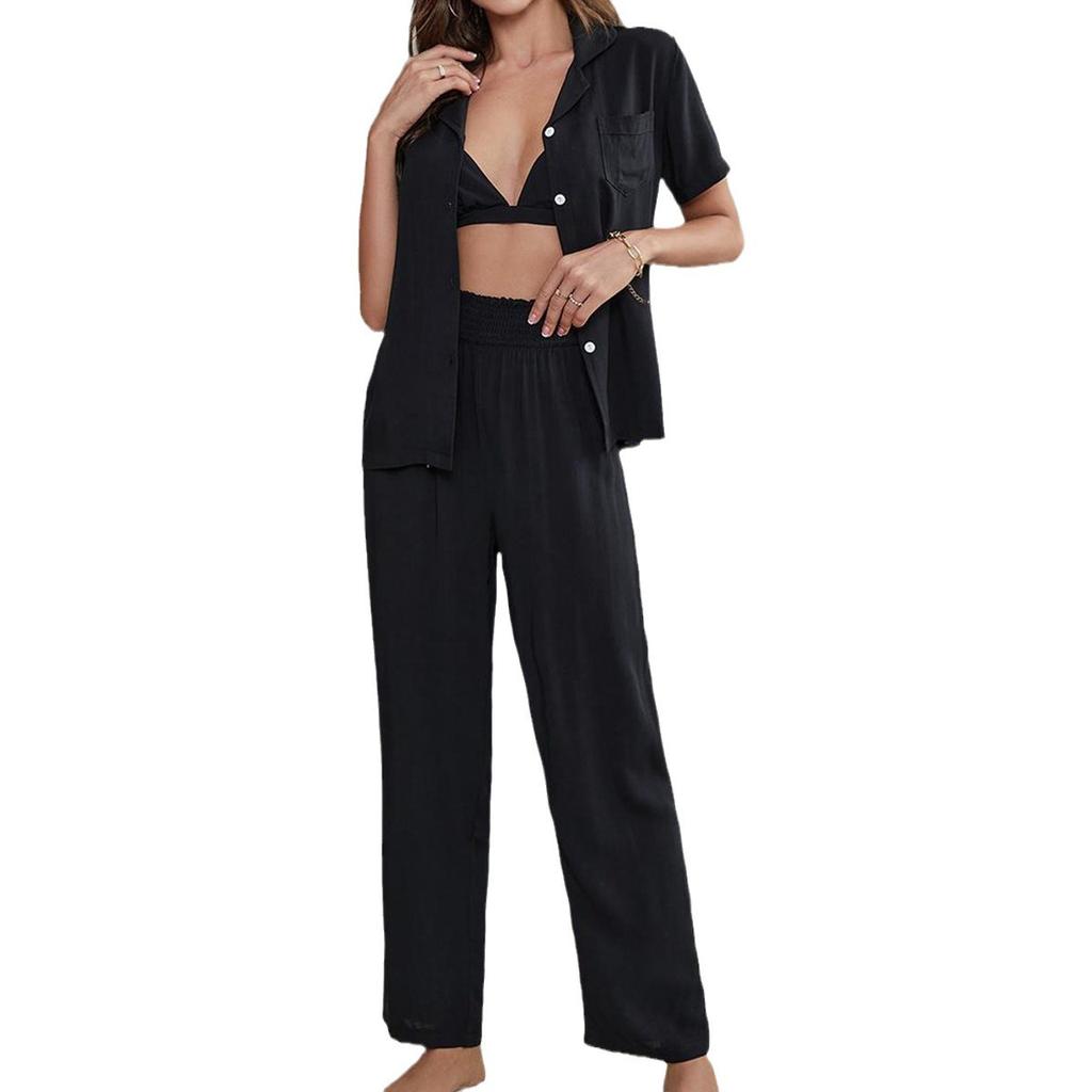 --РАССЛАБЛЕННЫЙ СТИЛЬ ПУГОВИЦ - Женские трехсекционные однотонные PJ имеют стильный воротник с выемкой BUTTON-UP TOP, брюки полной длины имеют ЭЛАСТИЧНУЮ талию, Удобный беспроводной бюстгальтер.