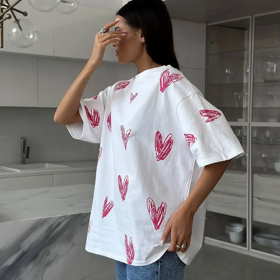 Повседневная женская футболка с круглым вырезом и принтом сердца, летняя свободная хлопковая женская футболка с короткими рукавами, базовые топы, рубашки, футболки, женская одежда — купить товар онлайн с бесплатной доставкой по всему миру!