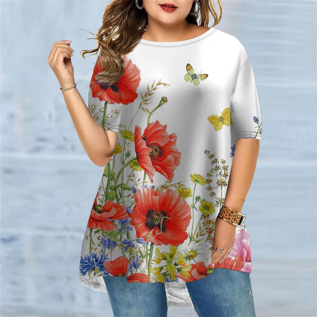 Женская летняя футболка с красным цветочным принтом больших размеров, удобная футболка с короткими рукавами и круглым вырезом, повседневная мешковатая футболка средней длины — купить товар онлайн с бесплатной доставкой по всему миру!
