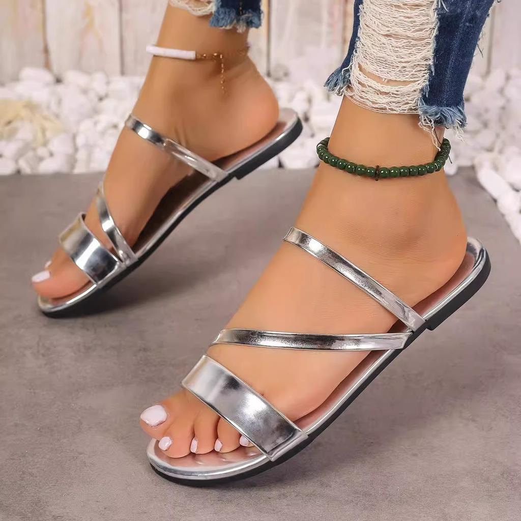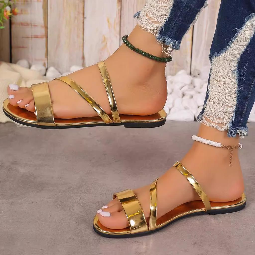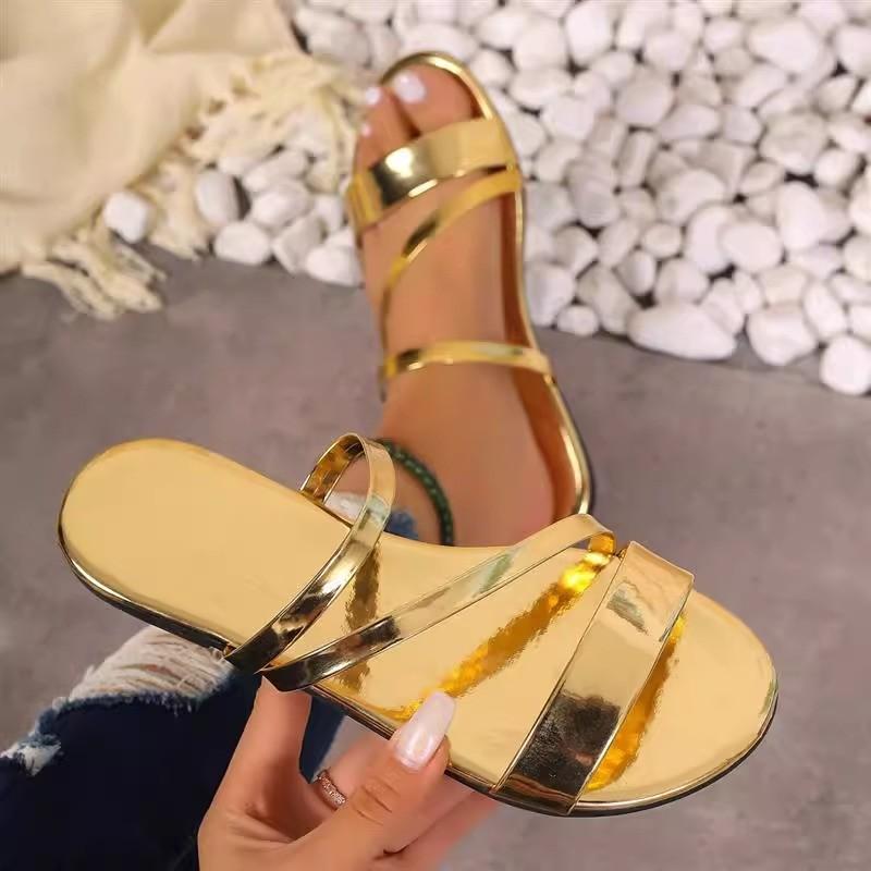 Летние женские тапочки, роскошные кожаные сандалии на плоском каблуке золотого и серебряного цвета, простые пляжные женские тапочки с узким ремешком, обувь для женщин