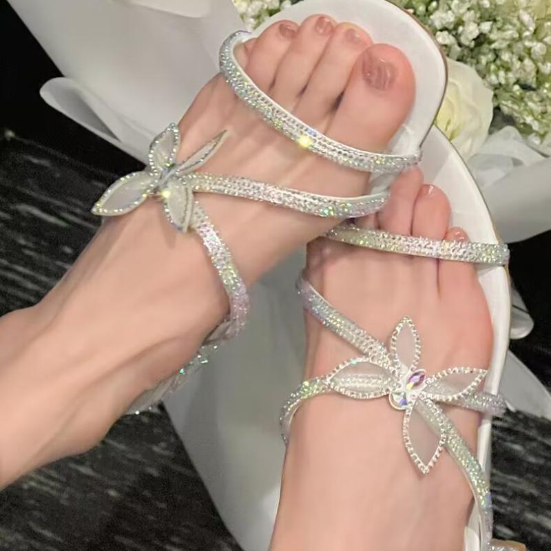 Новые сексуальные элегантные женские сандалии с круглой головкой, бабочкой, цветком и стразами, летние модные повседневные тапочки с открытым носком