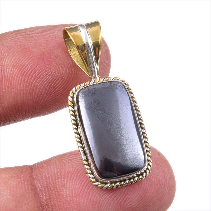 Natural Gunmetal Gemstone 925 Solid Sterling Silver Two Tone Pendant 1.25" j2B51