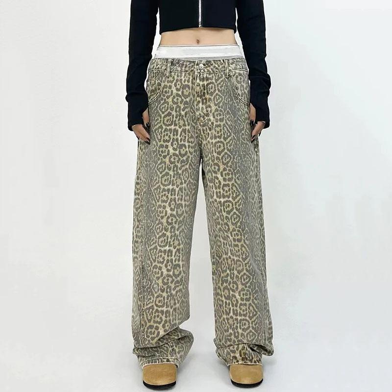 Ретро Хай-стрит повседневные комбинезоны с леопардовым принтом свободные широкие брюки для женщин Y2k хип-хоп мешковатые брюки-карго в стиле гранж
