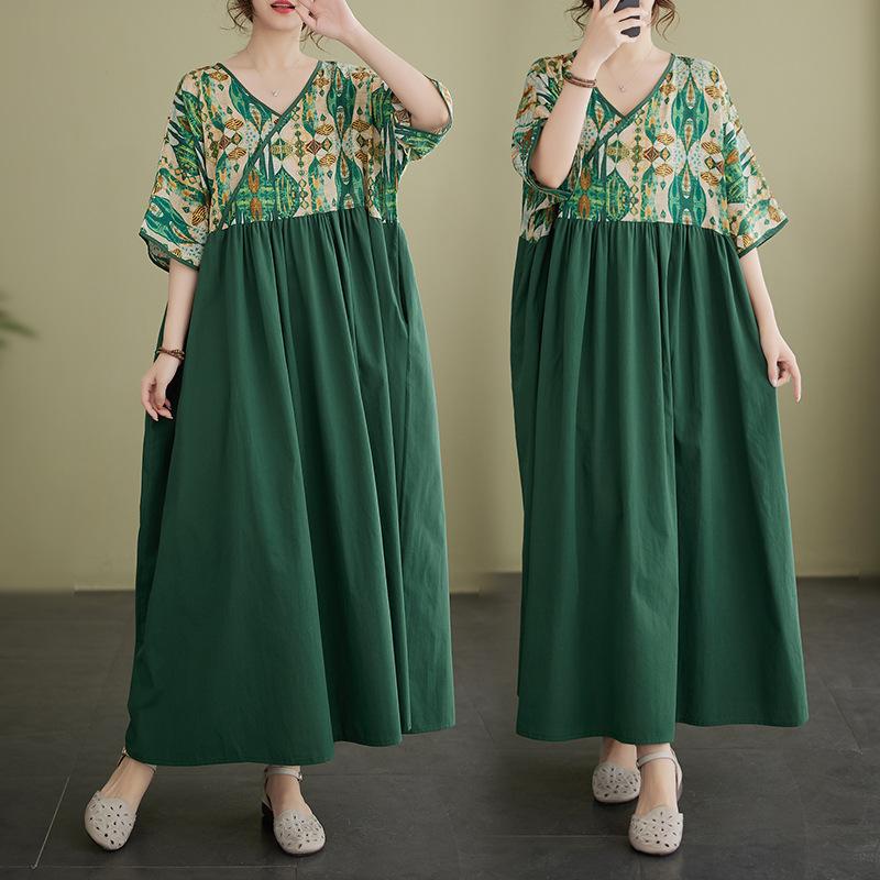 Женское платье больших размеров, богемные длинные летние платья с коротким рукавом и круглым вырезом с принтом