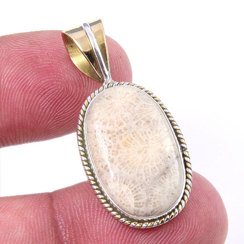 Подвеска из натурального ископаемого коралла из стерлингового серебра 925 пробы в двухцветном исполнении 1,25 дюйма Z2B07