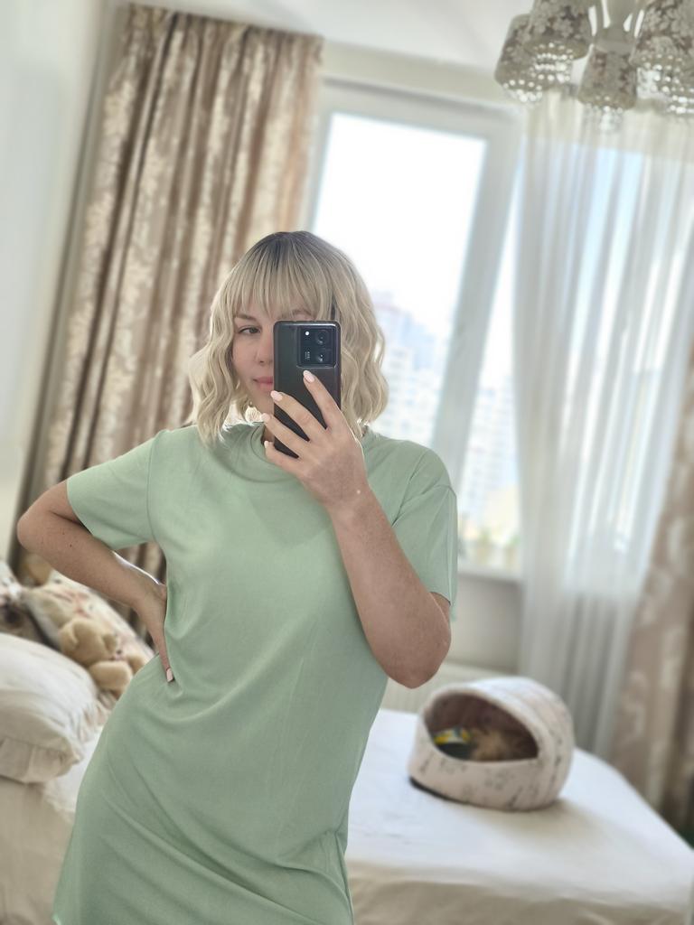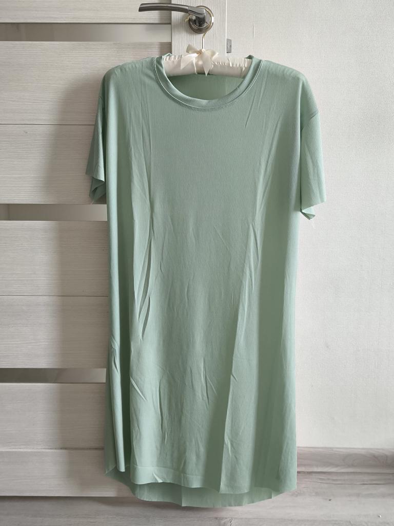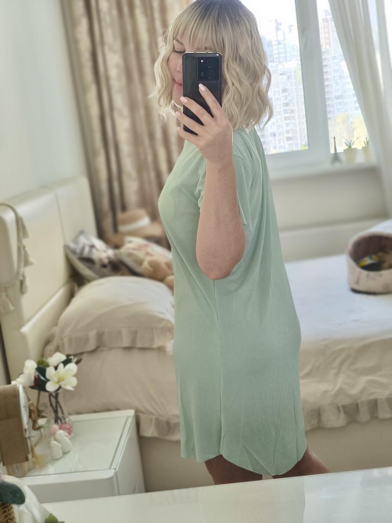 Футболка-платье 🌿 Очень понравилась 🥰 Ткань очень приятная тактильно, струящаяся, просвечивает, тянется. Летом, например на пляже, в ней будет не жарко, не смотря на то что это не хб. Ткань прохладная и отдаёт эту лёгкую прохладу телу. Размер единый. Мои параметры 90/70/95. Рост 162 см Сидит хорошо, смотрится аккуратно и красиво. Цвет нежный, очень приятный, не ядовитый, немного приглушённый. Рекомендую 🤗