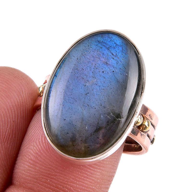 Натуральный Лабрадорит Драгоценный Камень Ручной Работы Серебро 925 пробы Двухцветное Кольцо S.9 v1i14