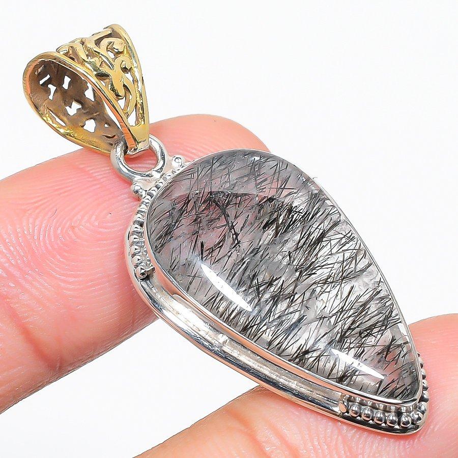 Natural Black Rutile Gemstone 925 Solid Sterling Silver Gift Pendant 1.75" L0L65
