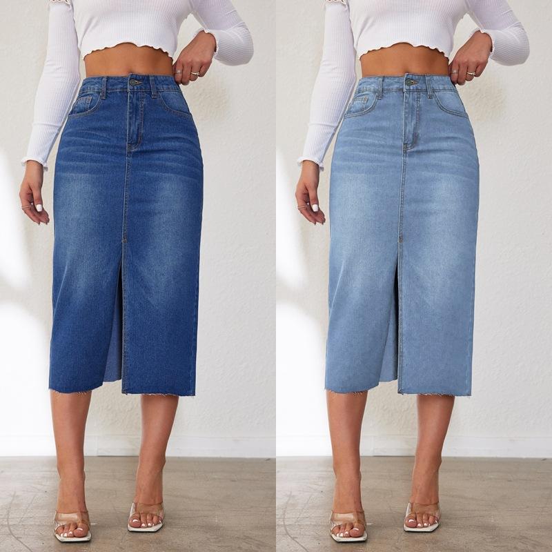 Женская джинсовая юбка, винтажная эластичная джинсовая полуюбка средней длины с разрезом, полуюбка — купить товар онлайн с бесплатной доставкой по всему миру!