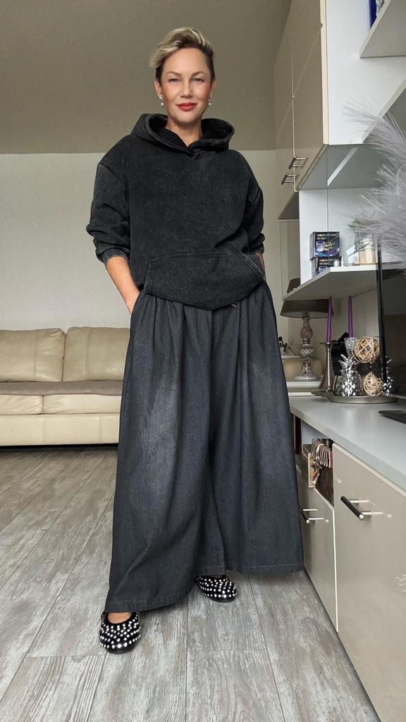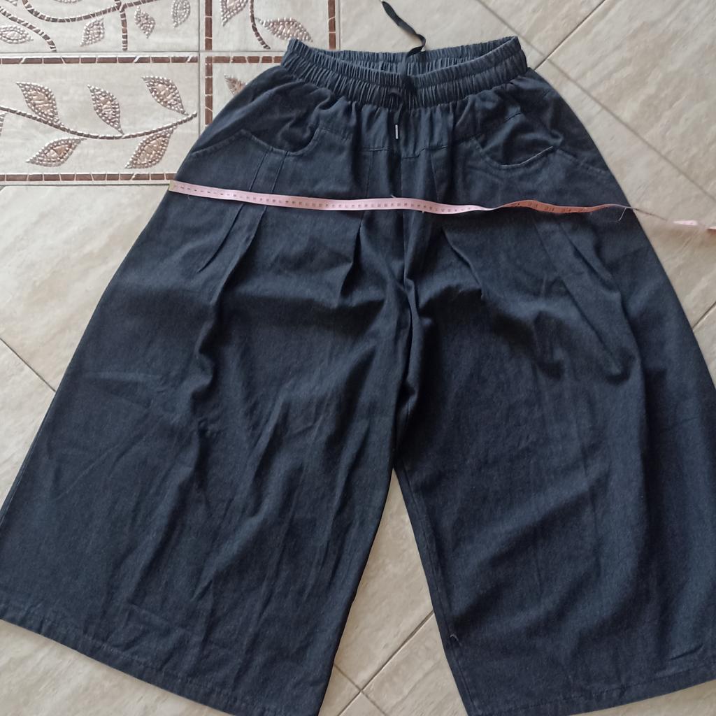 Джинсовые брюки- юбка ✔️Размеры М-2XL. Мои параметры : 167, 96-82-98. На мне размер L. По размеру отлично. ✔️Фасон: Посадка высокая На талии широкая резинка и шнурок Боковые карманы глубокие Сзади накладной карман. ✔️Ткань : классическая джинса, не тянется, местами потёртости. ✔️Пошив фабричный. 📐Замеры: ОТ 66-100 ОБ до 170 Высота посадки 39 Длина внутреннего шва 57,5 Длина 97 Ширина брючины внизу 54 Ширина брючины в районе бедра 50